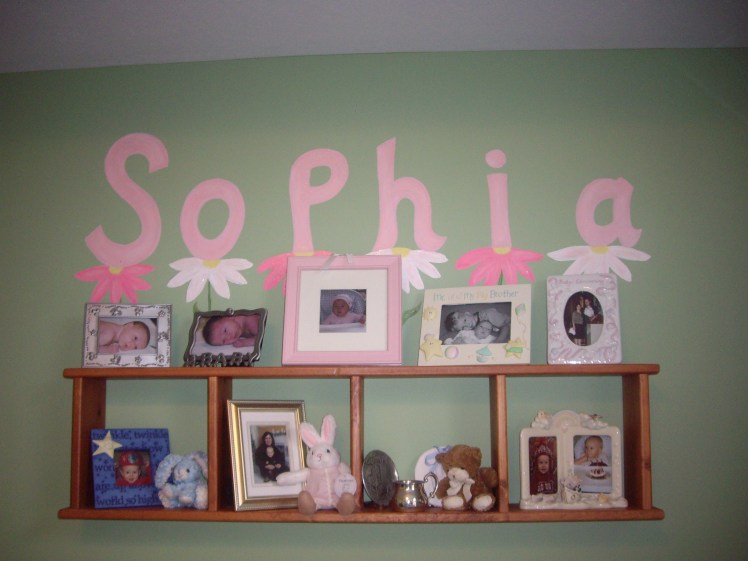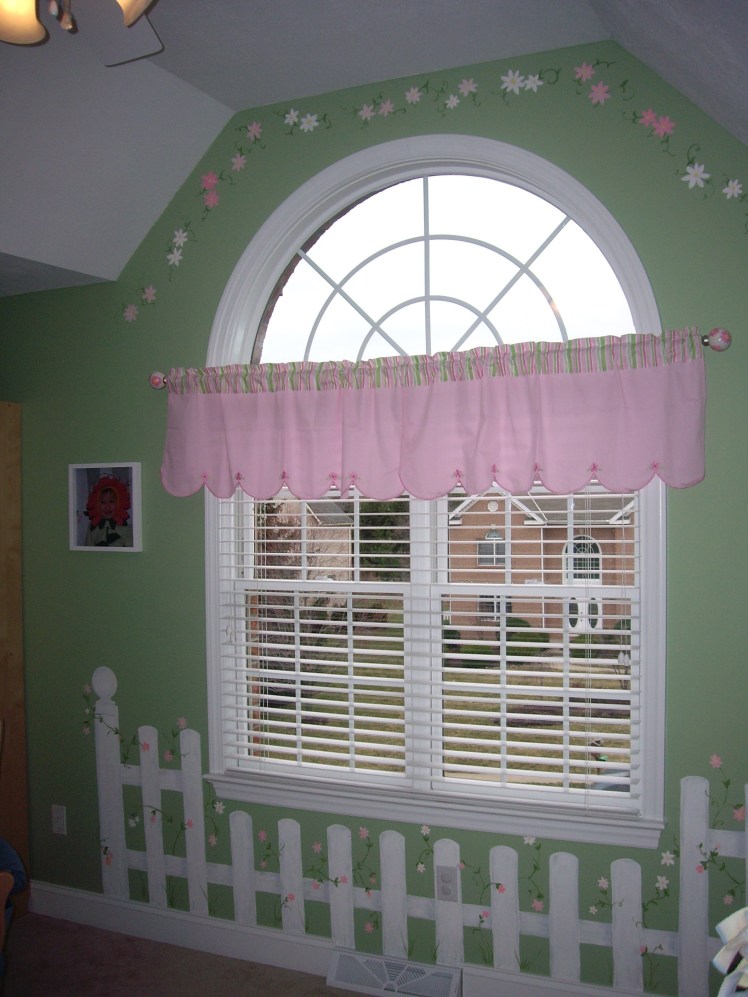 Pottery Barn’s bedding theme and window treatment for a nursery inspired me for this mural and coordinating colors. Loved painting flowers on picket fence and up around Palladium window. To help on budget, I painted the ceramic finials rather than buying new ones. Name above book shelf worked well on flowers. Thank you Cathy for giving me opportunity for to create Sophia’s happy room.
