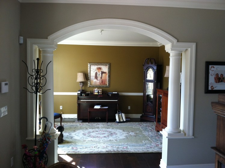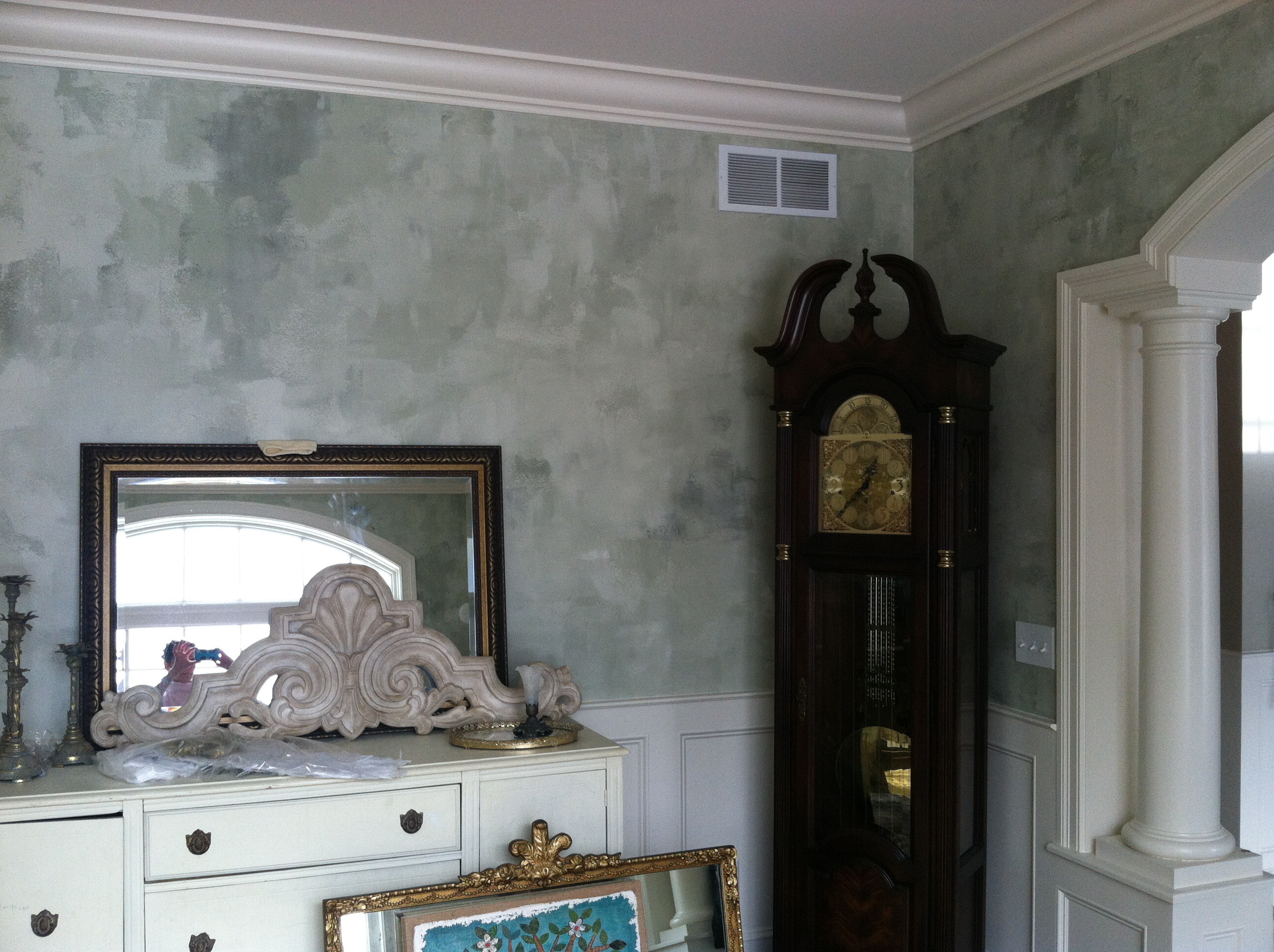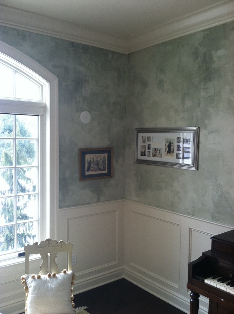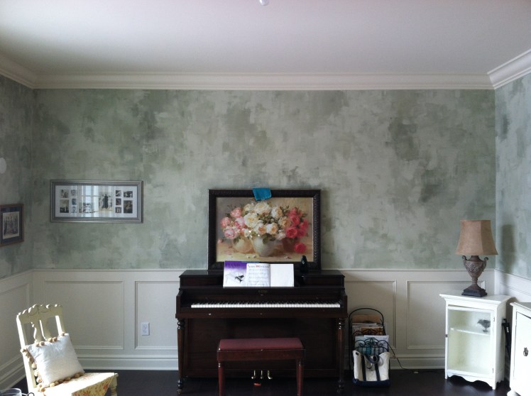 Creative paint finish for this living room/music room using three soft colors to pull in artwork, area rug, and furnishings. Troweled process of adding paint to the walls creates a very abstract design which is full of life. Loved that my customer Jen wanted something personal and creative for her space.