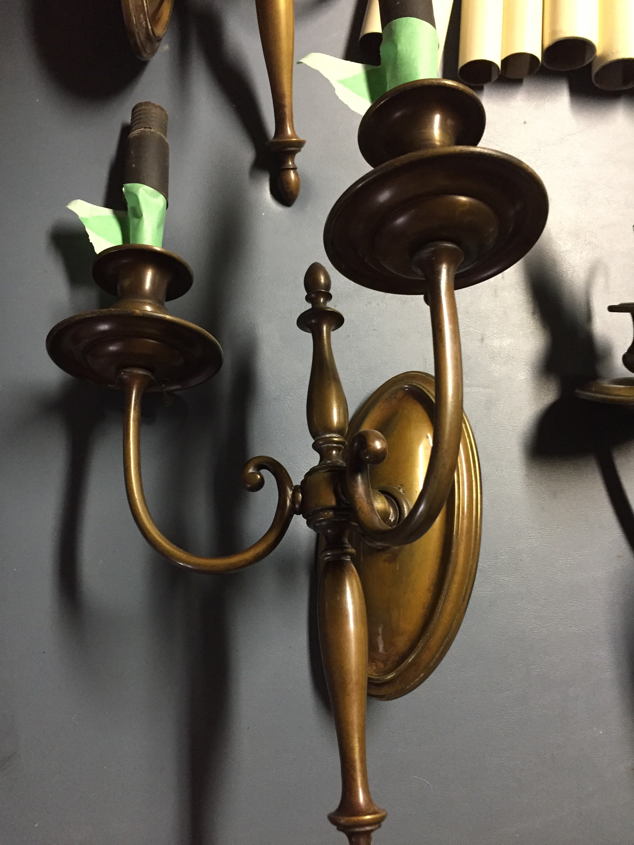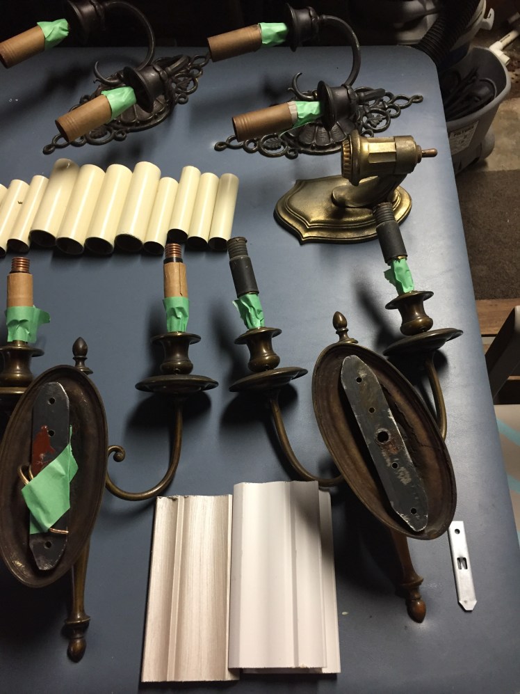 What a wonderful idea to restore these antique sconces so they may enjoyed by the new owners for years to come. Two are mounted inside the dining room, four brass inside main hallway, and one small fixture into the powder room in a different custom finish.