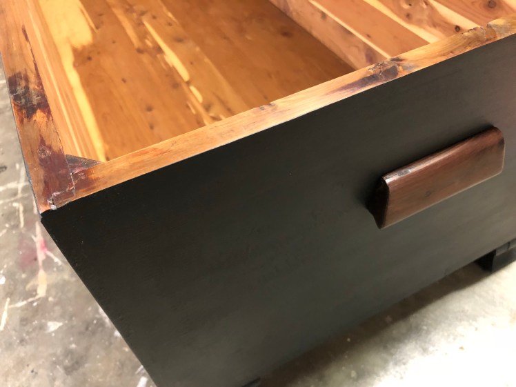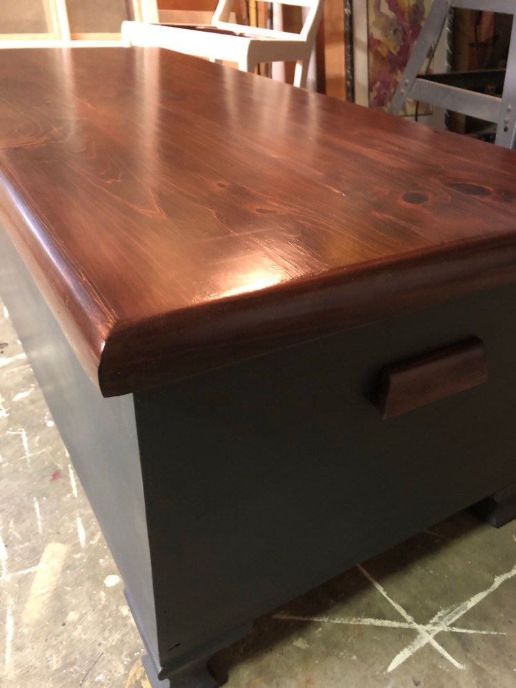 When I take on new projects, I always wonder where these pieces have been over the years. Susan had been given this cedar chest from her folks after they had enjoyed it growing up. Love how special keepsakes travel with families. The top had some wear and holes were filled and old finish sanded down. Custom dark cherry stain applied to top and handles to coordinate with some of her current dining room pieces and decor. The sides and feet are in Annie Sloan chalk paint and made the piece come to life! I love the simple details on this piece and new look. Very well constructed and ready to enjoy along with all the memories. Thank you Susan for the opportunity to be creative on this piece!