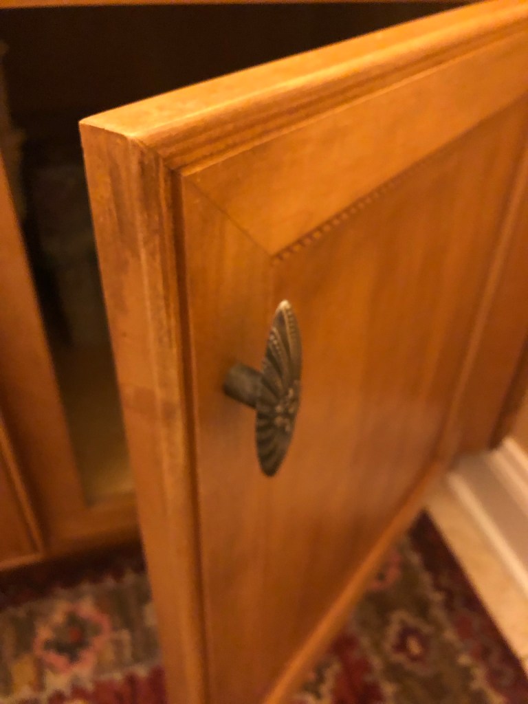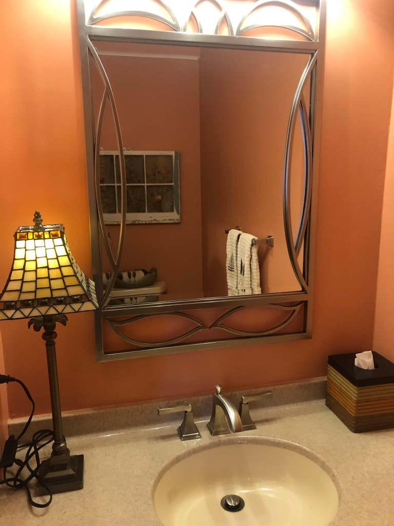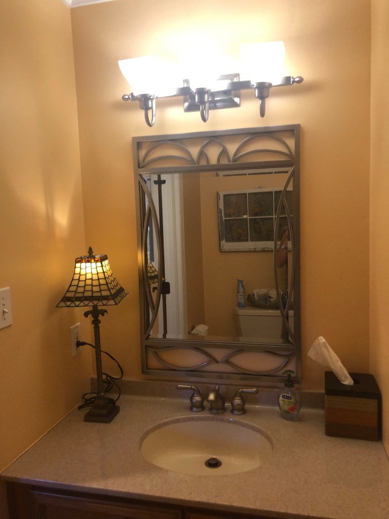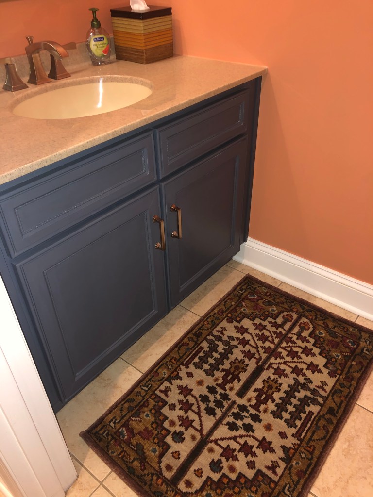 It was fun to transform and paint this maple vanity and coordinate with existing countertop, mirror, floor, new lighting and updated wall color! So affordable rather than replacing cabinets!