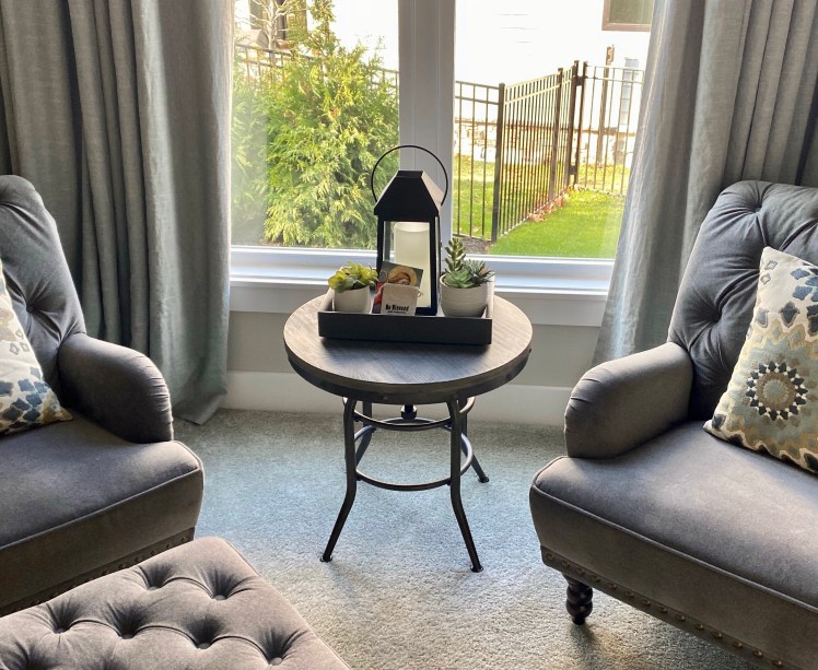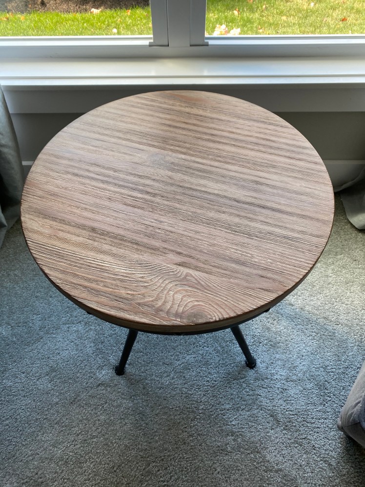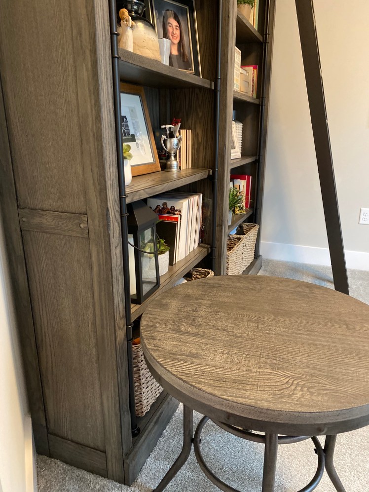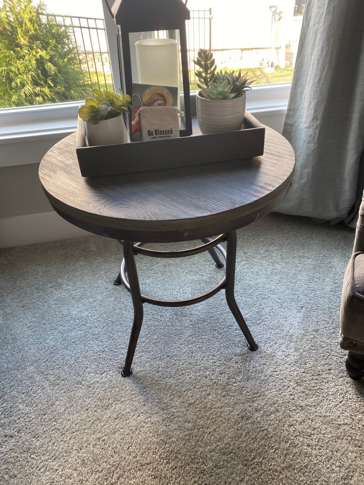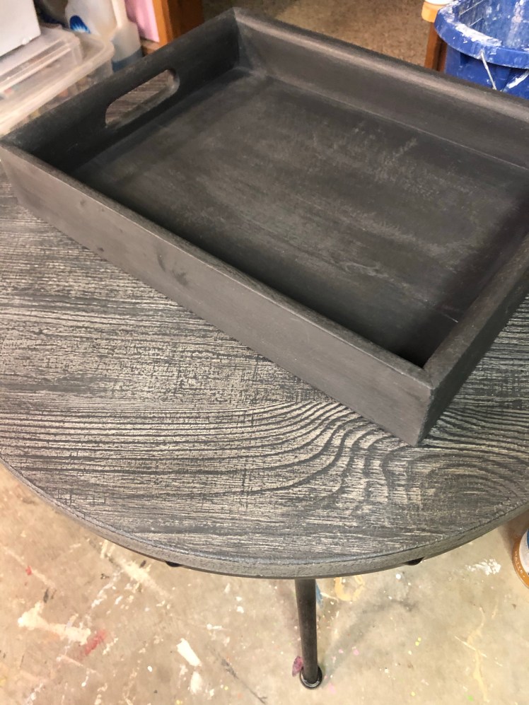 Loved creating a custom top finish on this beautiful accent table to coordinate with shelving and newer furnishings. Such a small change but big difference with colors in the room. Painted the wooden tray also for final touch and design!