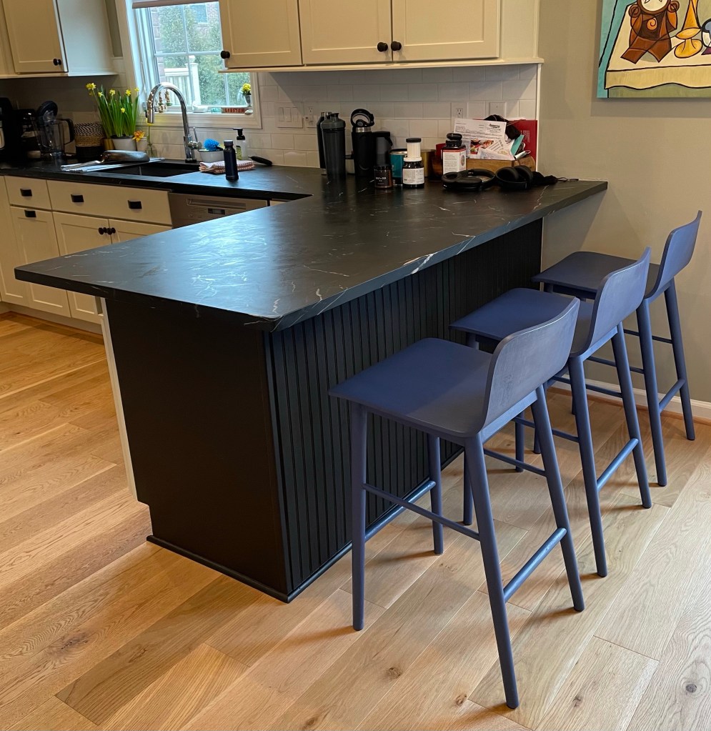 Wanted to share this spring project updating a kitchen peninsula and adding color to three bar stools in this updated kitchen!