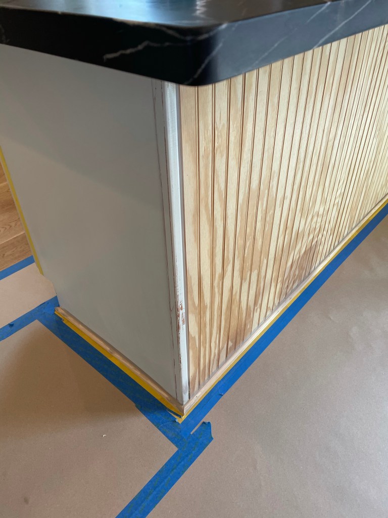 Bead board was added to the outside of the peninsula and then primed and painted with Fusion’s Coal black. Love the texture/color under the beautiful sandstone countertop.