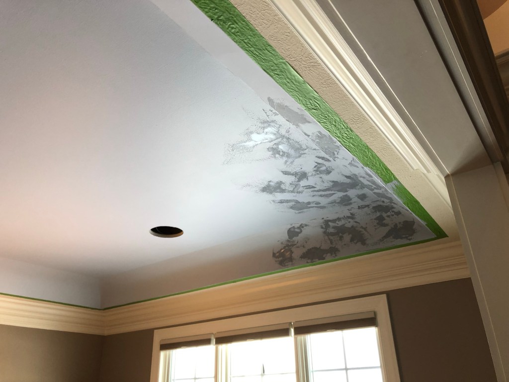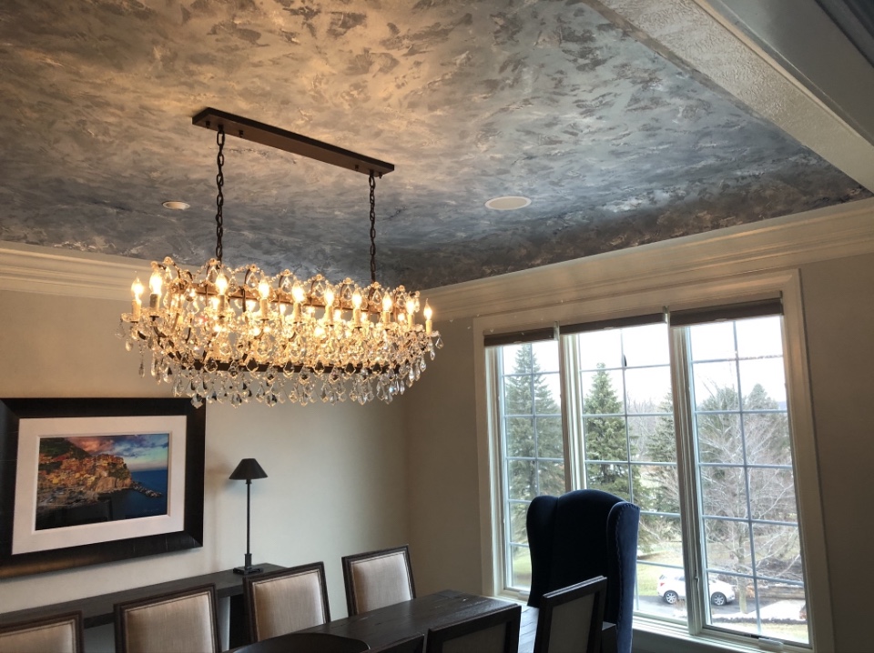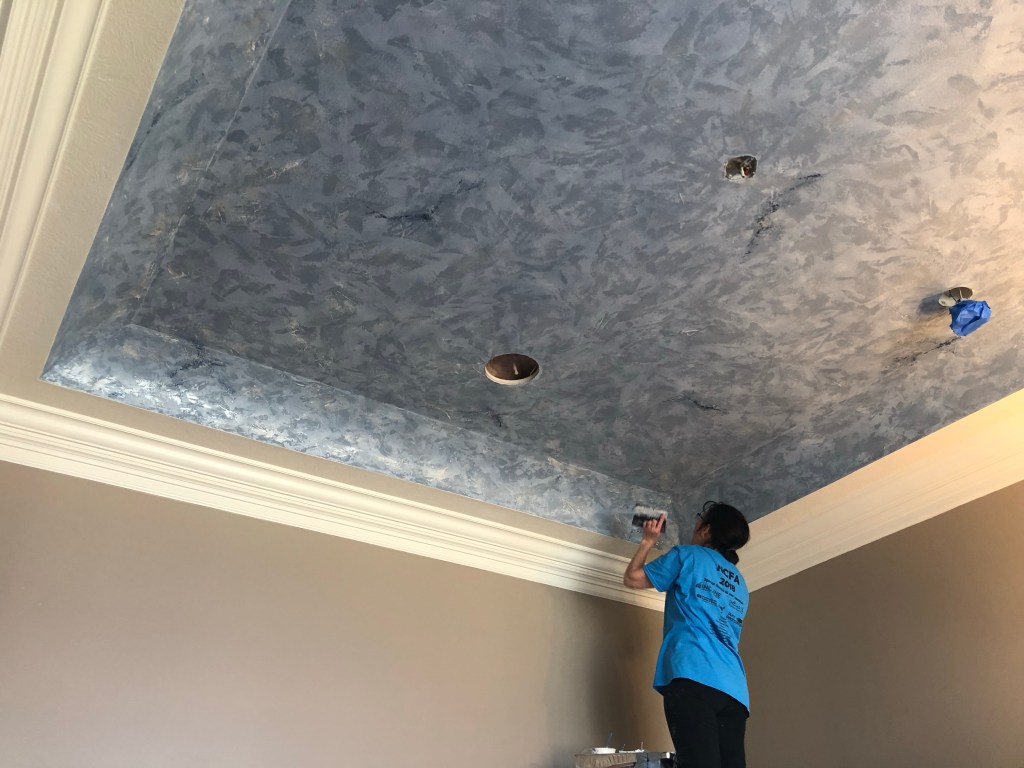 This faux finish involved painting 7-8 layers of colors after creating base of texture on this large dining room tray ceiling.