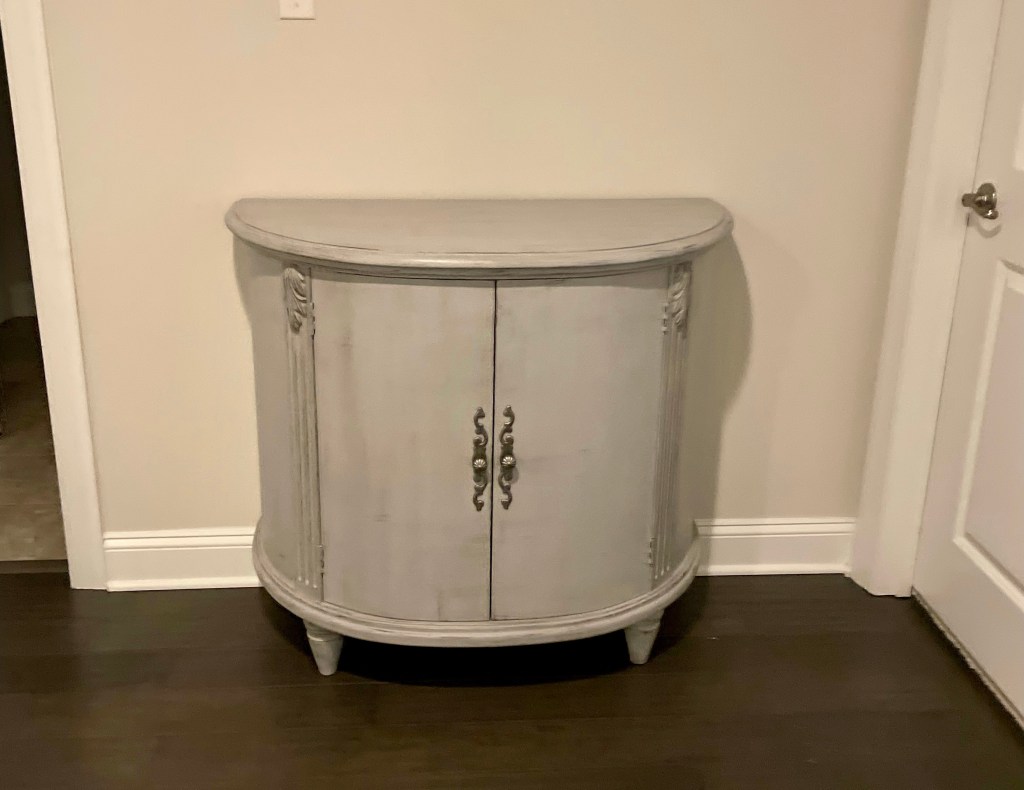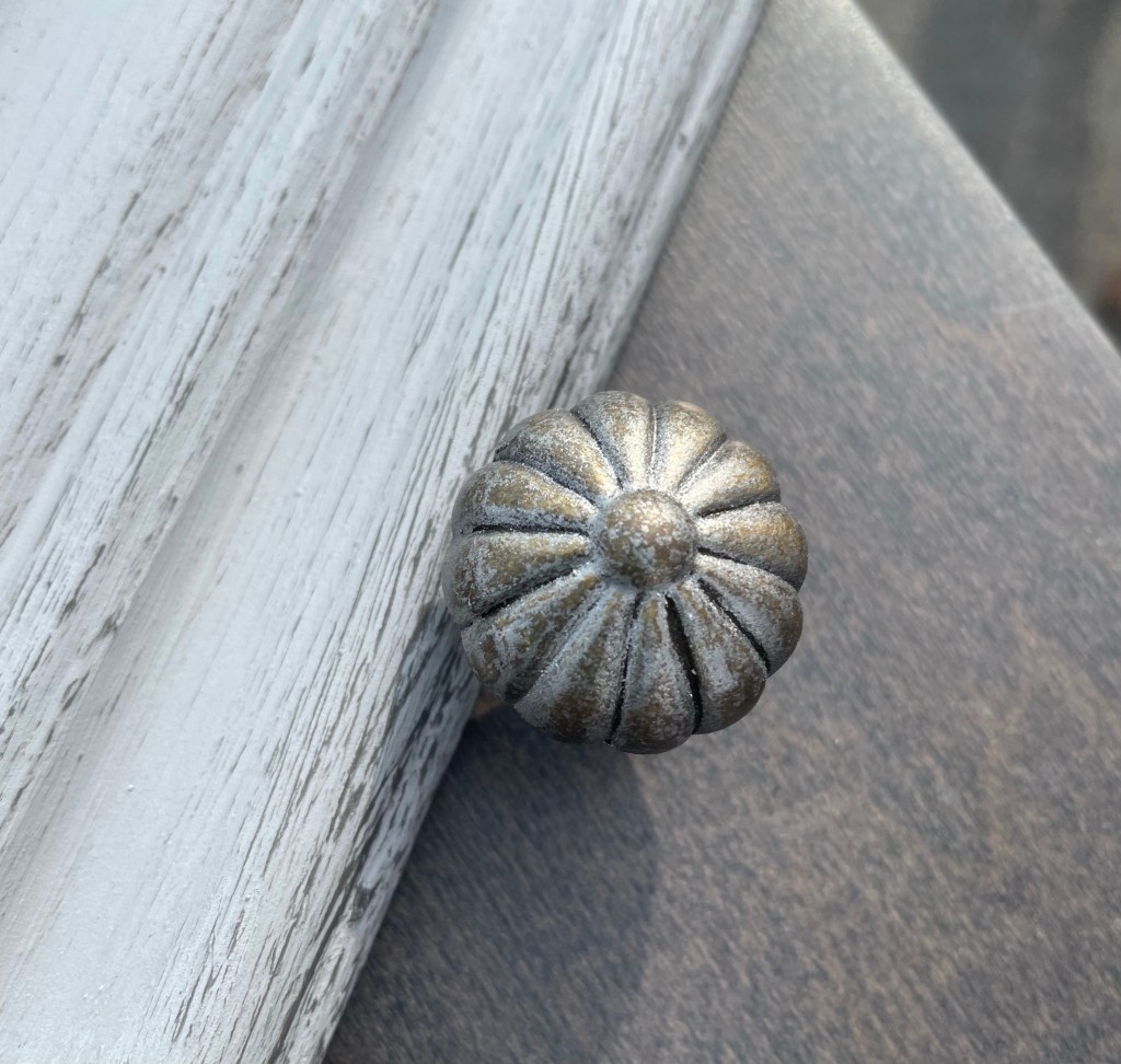 It was fun working with Annie Sloan’s light Chicago Grey paint and adding a charcoal distressed finish. Painting original gold hardware with dark silver worked nicely to update without buying new!