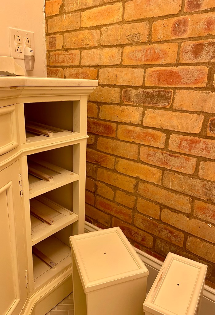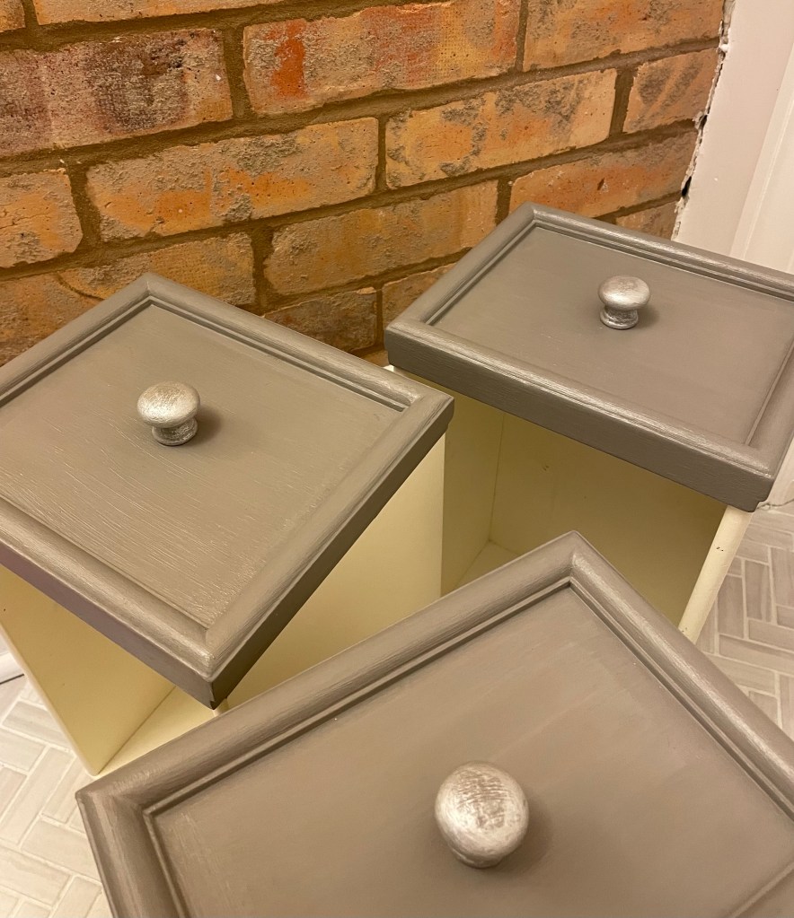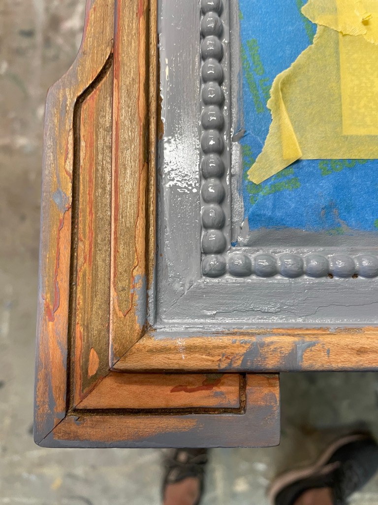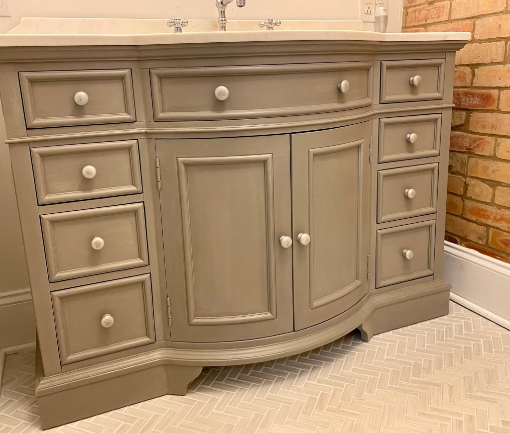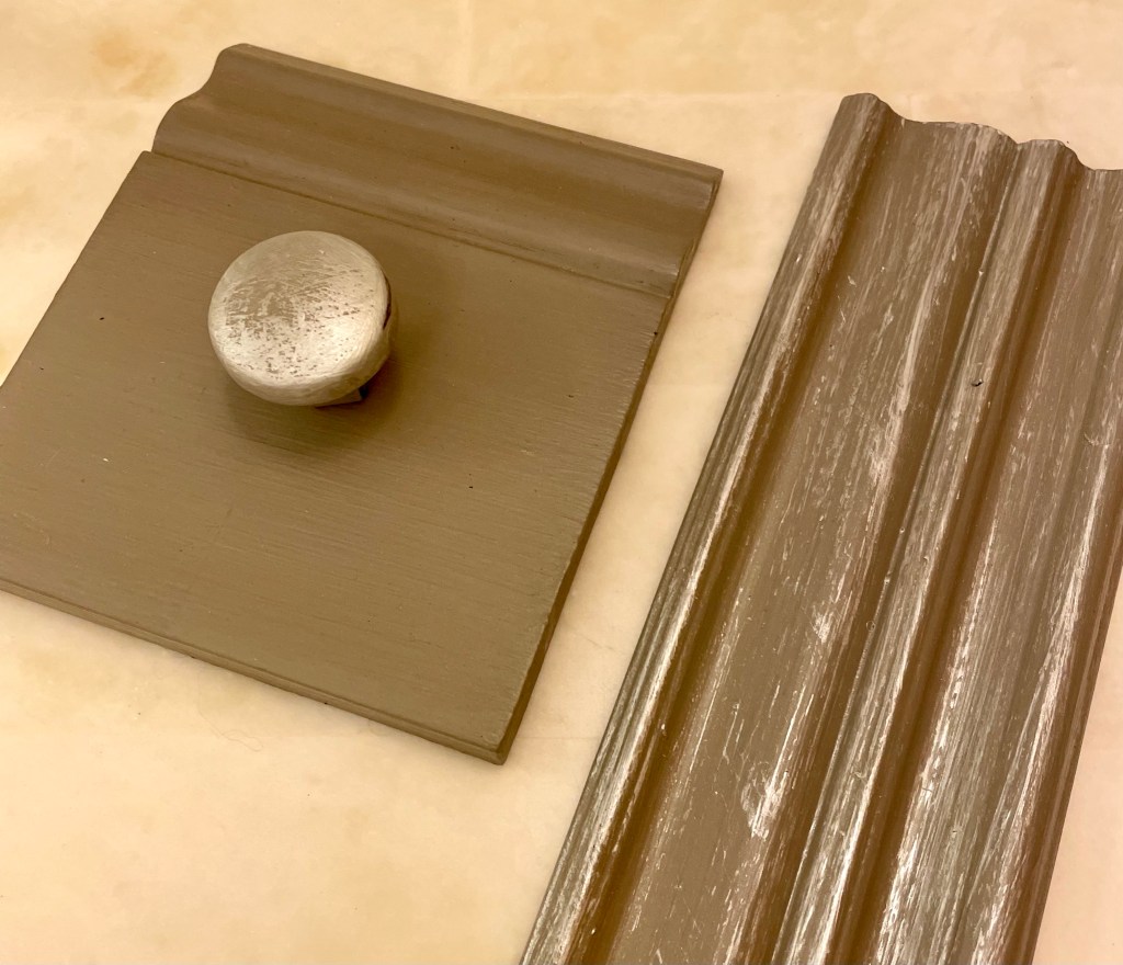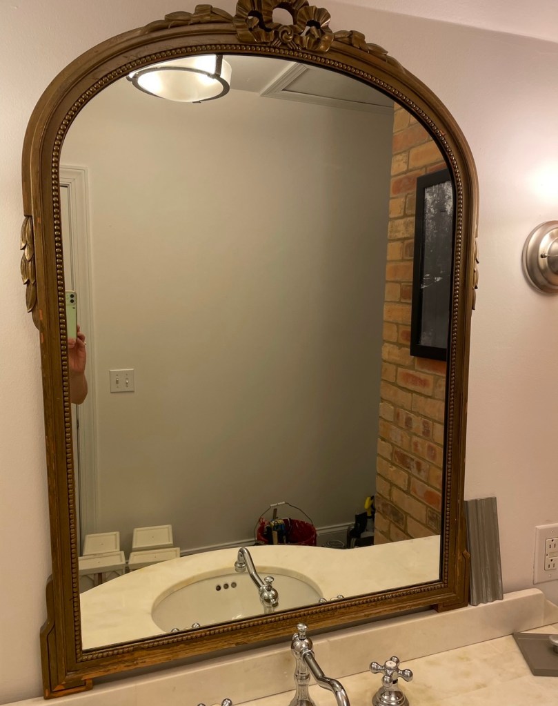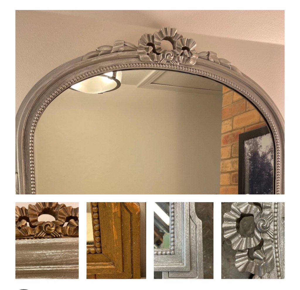 This was a fun transformation in an older charming home on a special antique mirror and a well-loved master vanity. It truly made sense to change into a warmer Annie Sloan French Linen color and add hint of dark silver metallic to the details on the mirror and knobs to coordinate with the new room decor.
