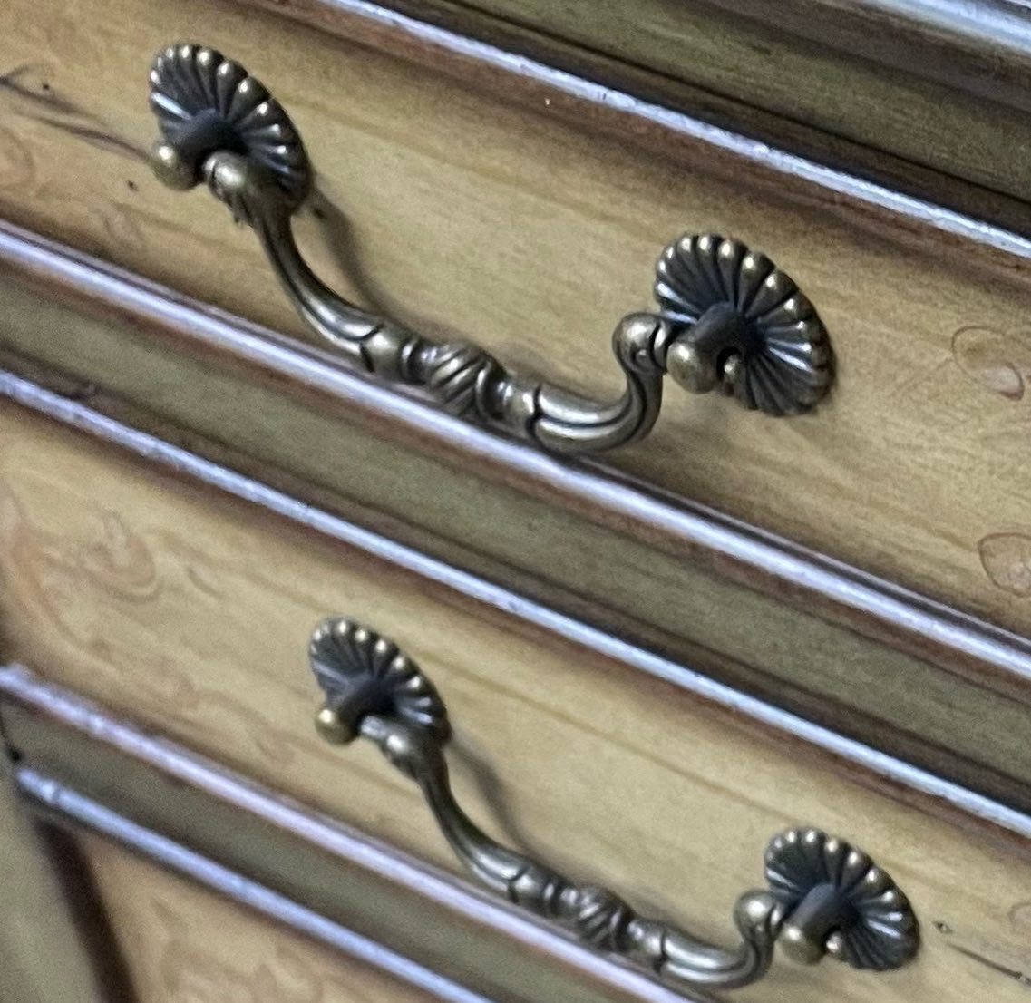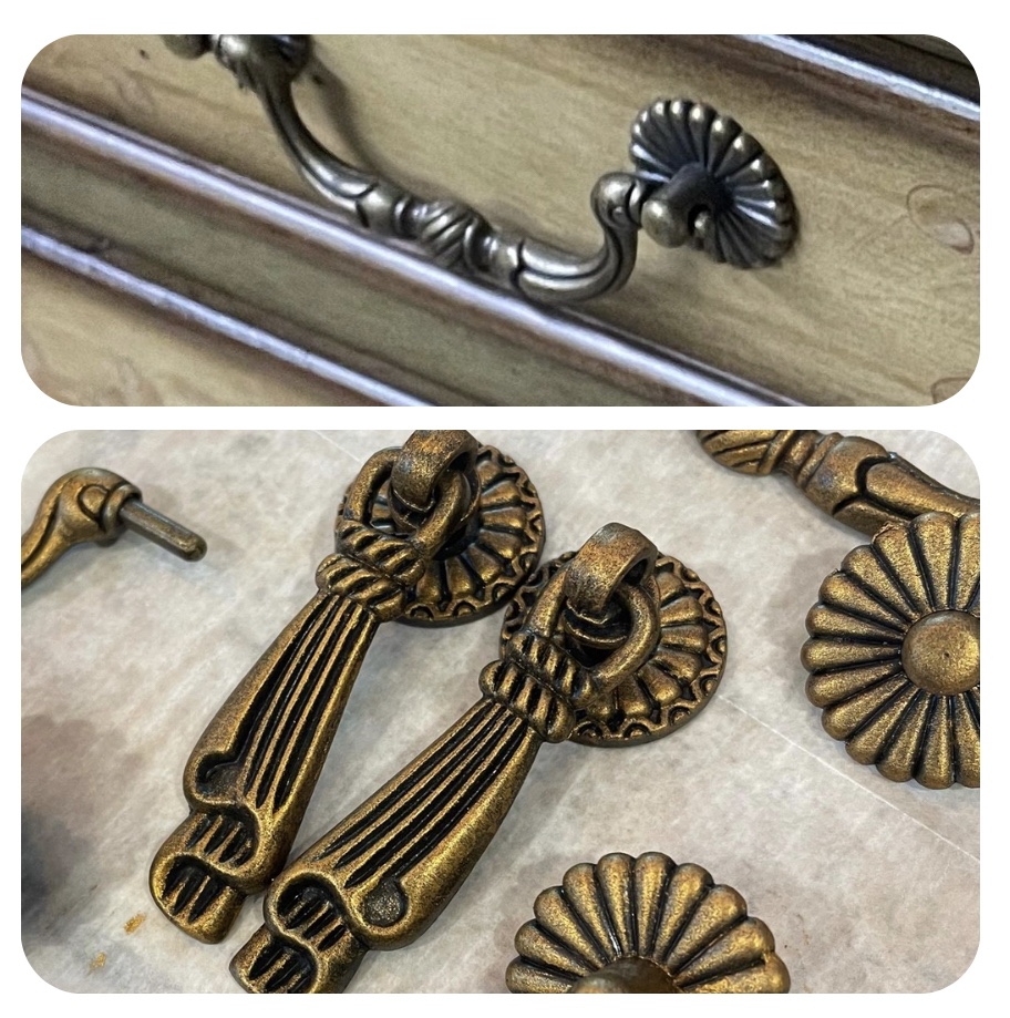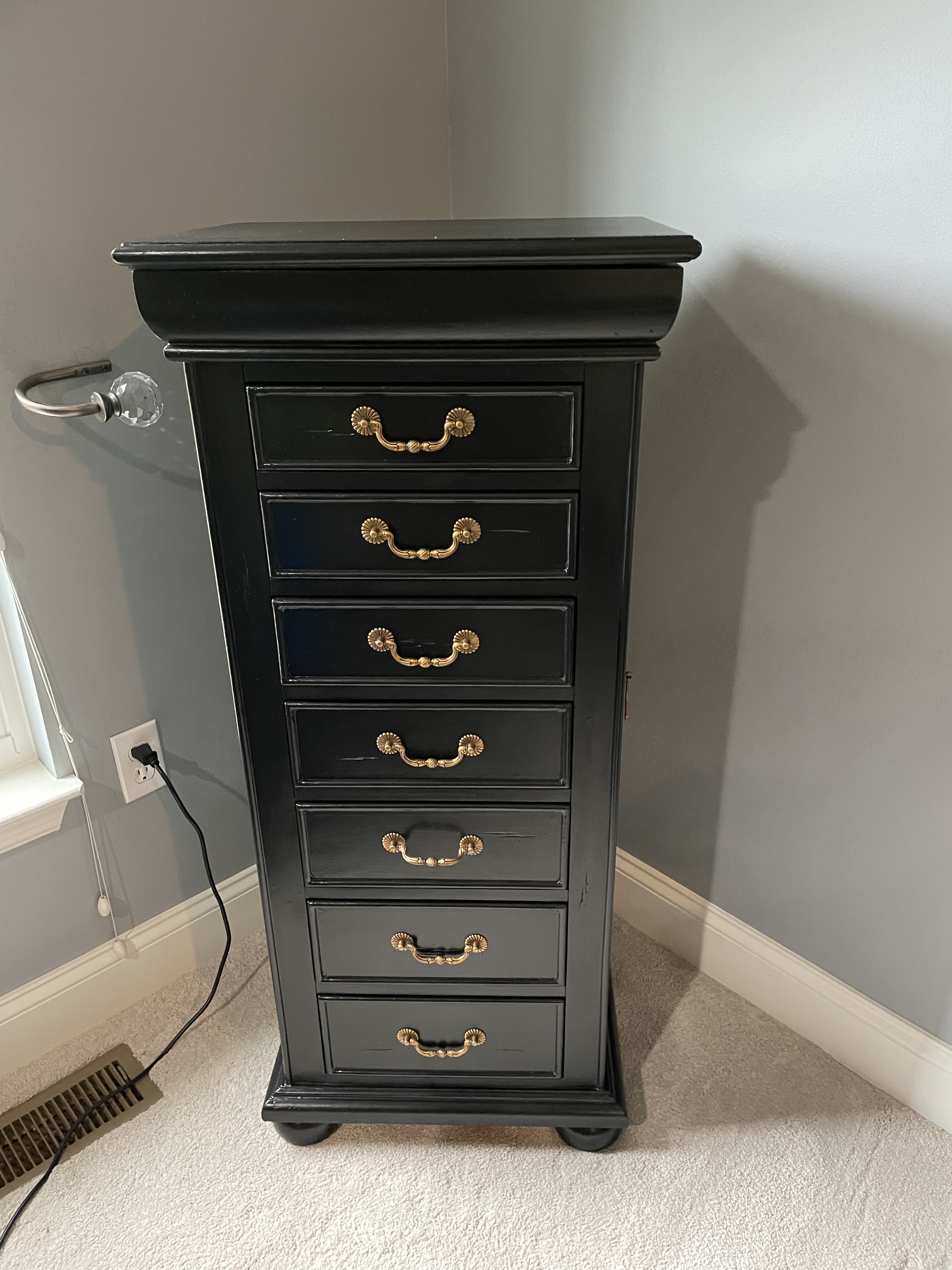 Coal black with custom gold on existing hardware was a beautiful choice! Love the details on this piece and natural distressing in the wood for character. The satin finish sparkles in the room like jewelry and coordinates with the other furnishings!