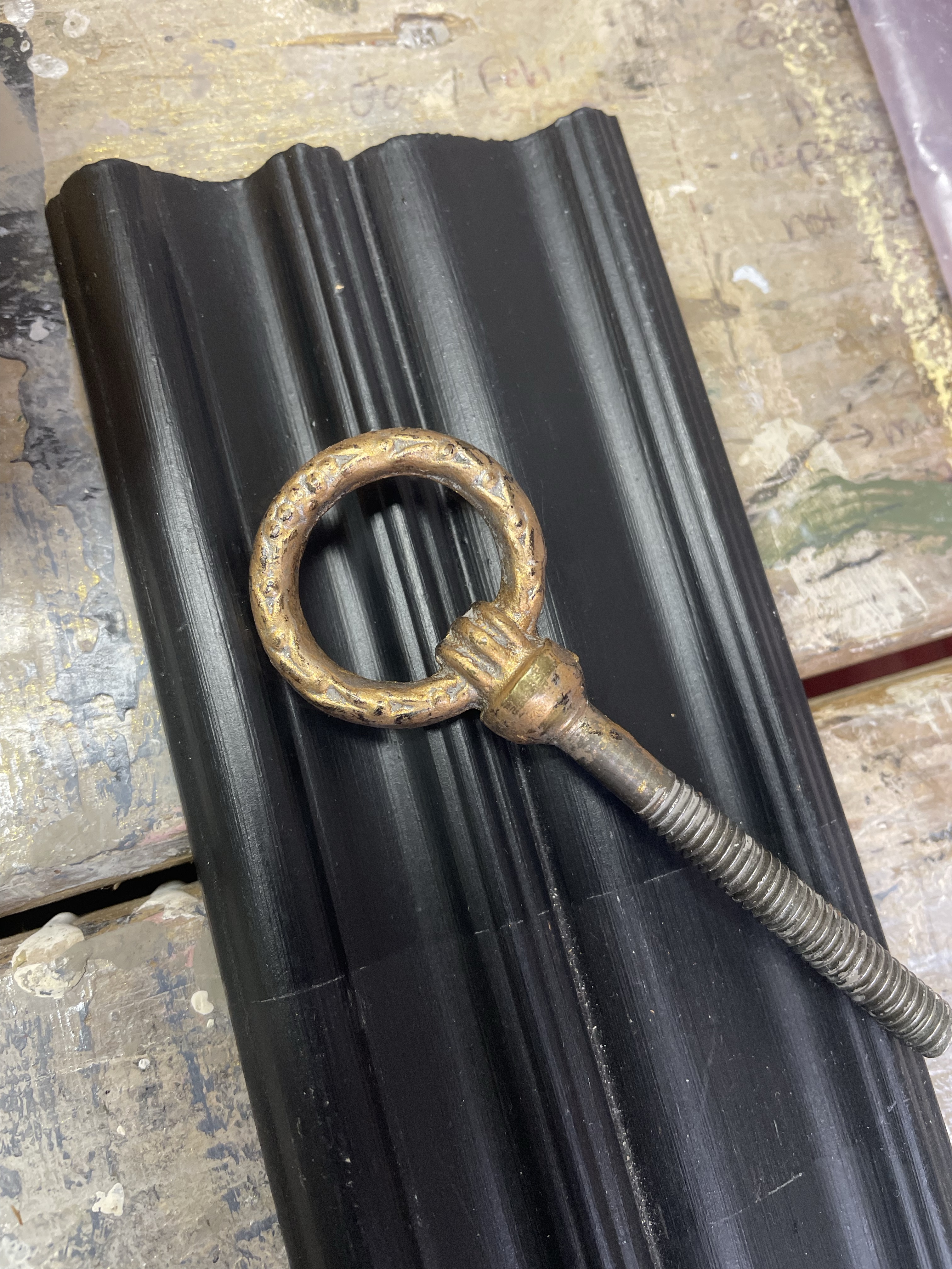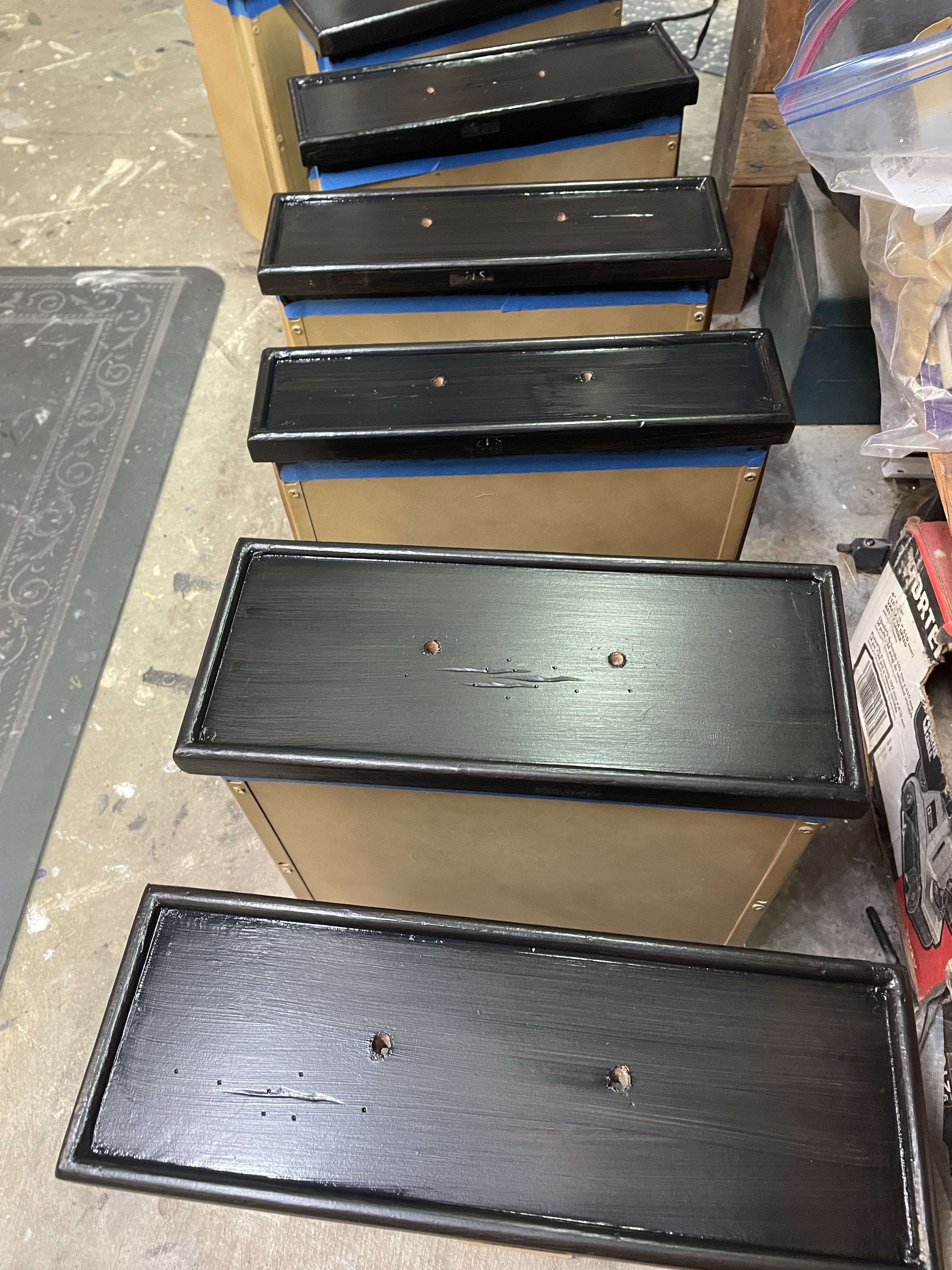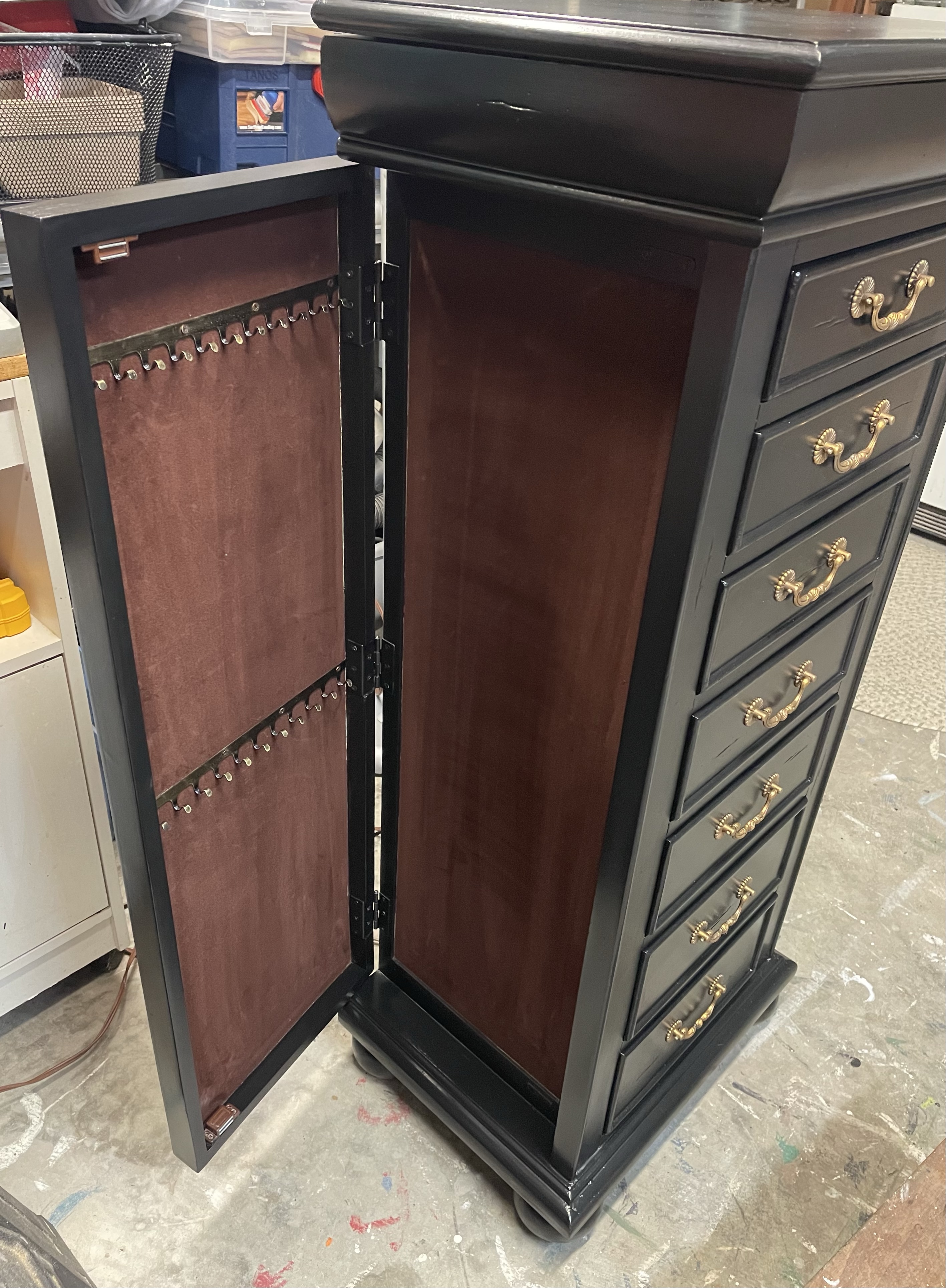 Coal black with custom gold on existing hardware was a beautiful choice! Love the details on this piece and natural distressing in the wood for character. The satin finish sparkles in the room like jewelry and coordinates with the other furnishings!