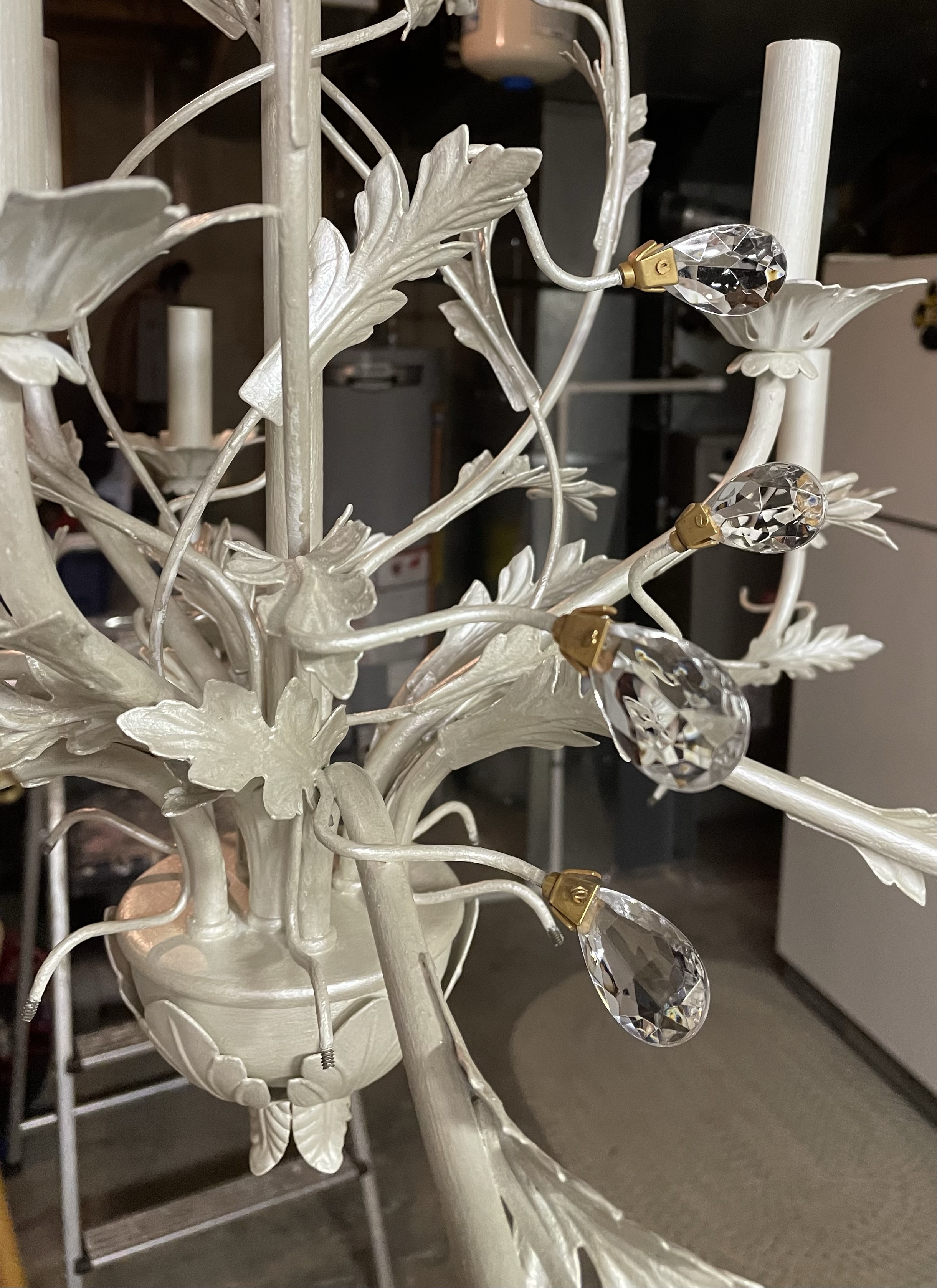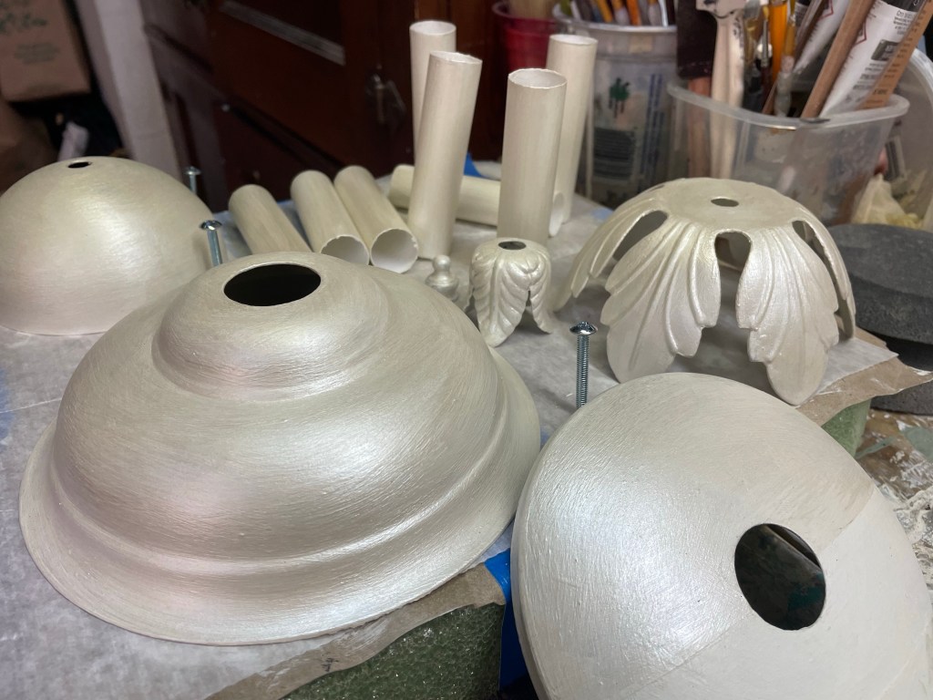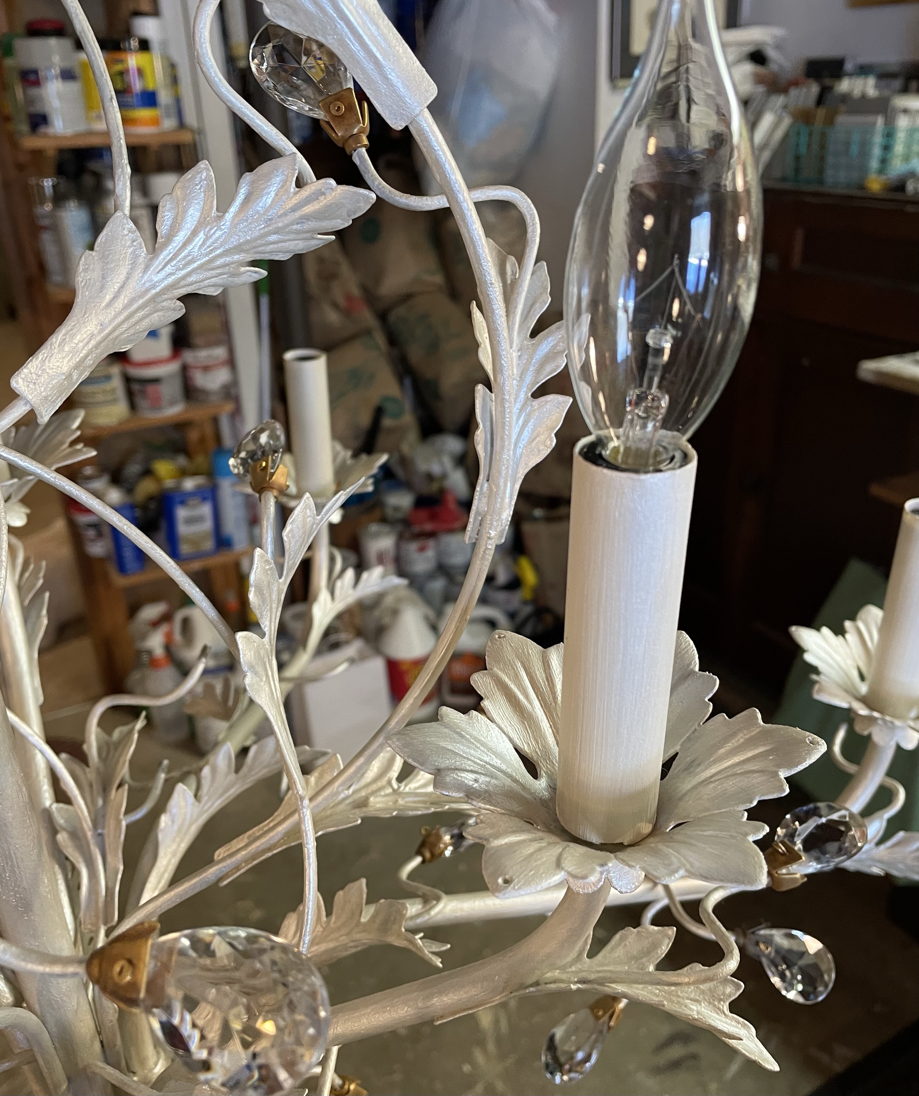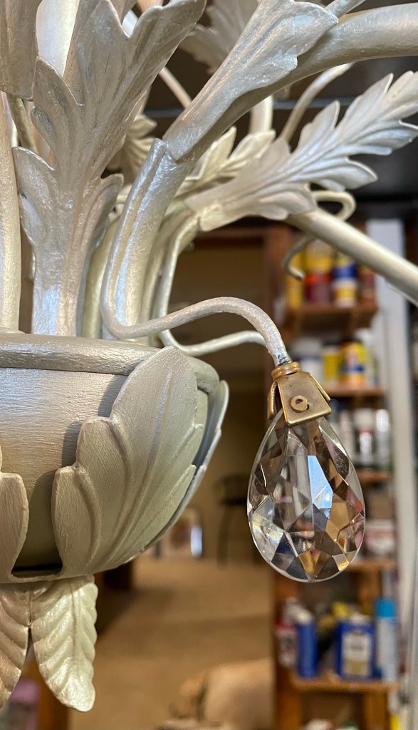 Next, we discussed a new metallic finish to lighten up the older dark brass chandelier with leaves and crystal details. My crazy art brain began mixing colors and it was great to agree on a creamy pearlescent finish! This chandelier was tricky getting to all the tiny spaces but a fun challenge!