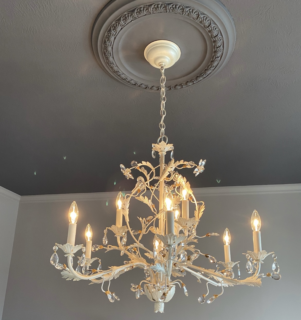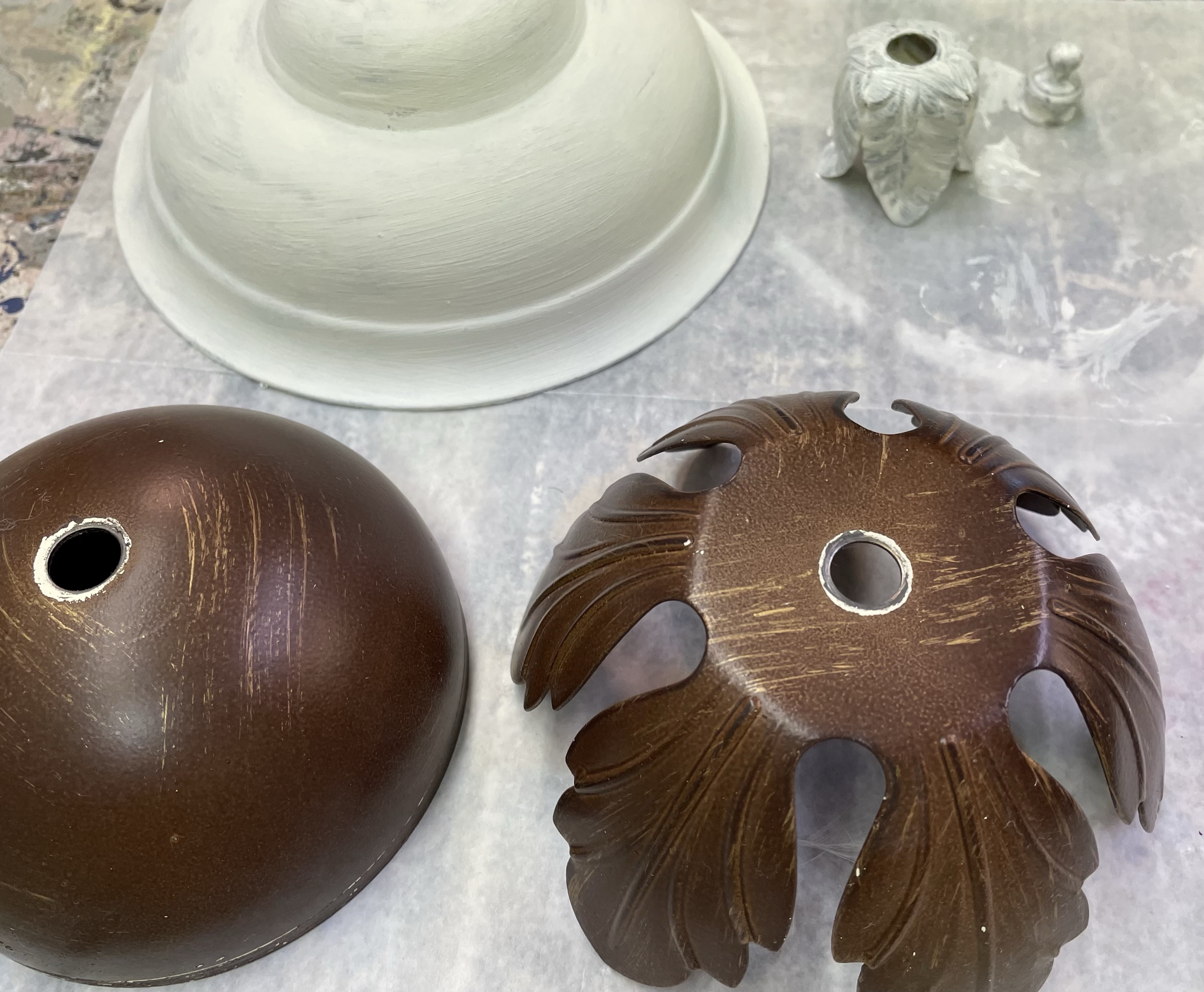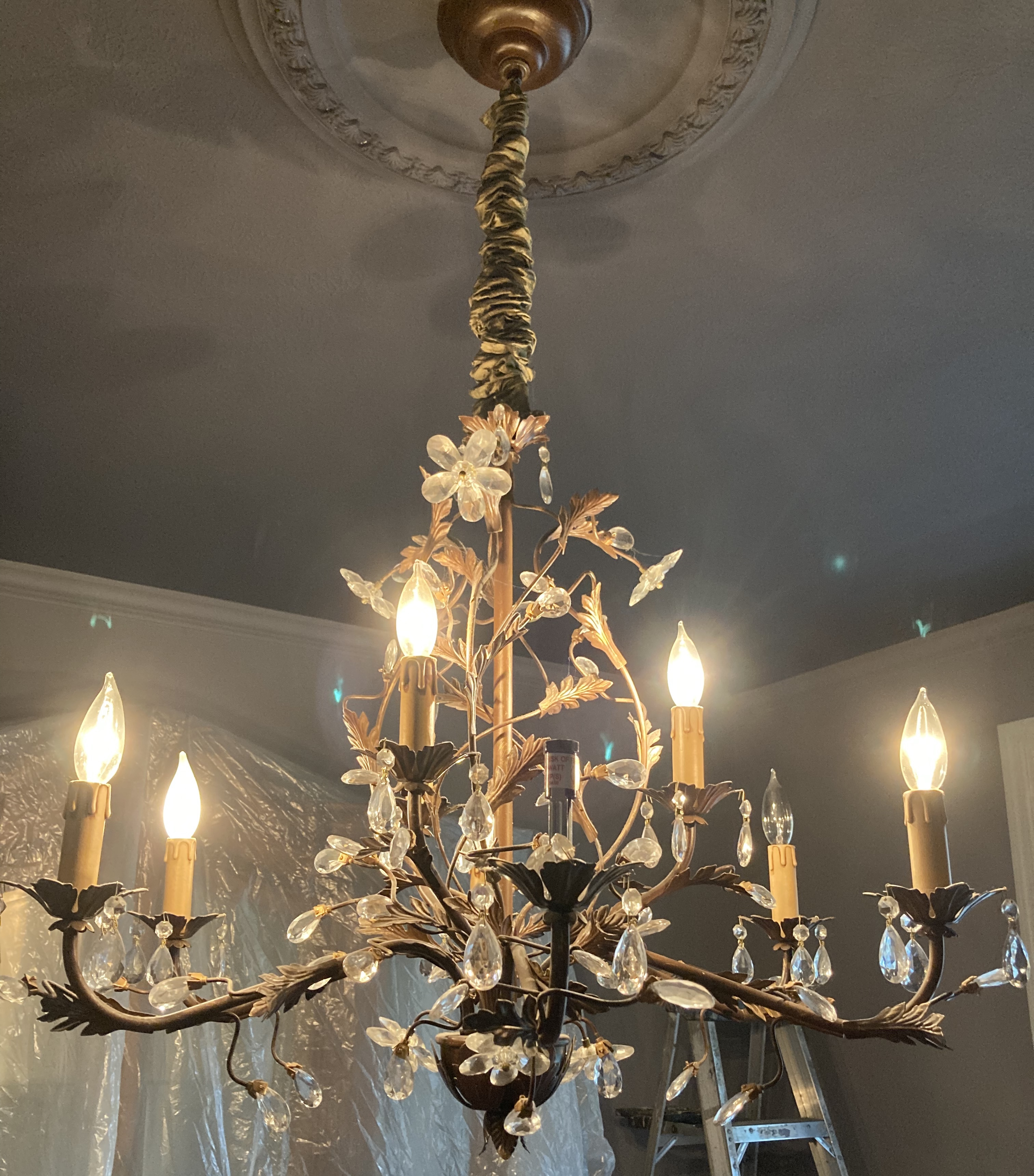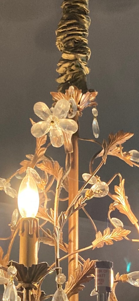 Next, we discussed a new metallic finish to lighten up the older dark brass chandelier with leaves and crystal details. My crazy art brain began mixing colors and it was great to agree on a creamy pearlescent finish! This chandelier was tricky getting to all the tiny spaces but a fun challenge!