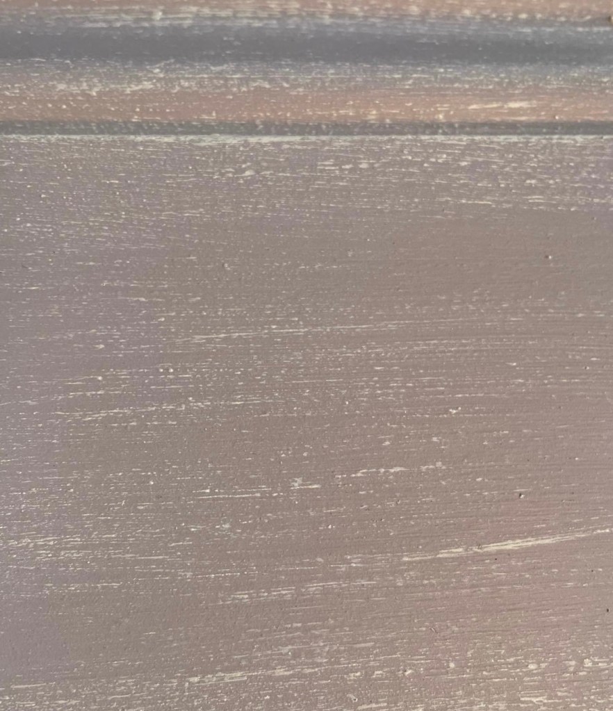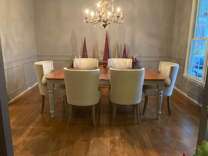 Table had been used for years in the kitchen and held special memories. It was in great shape and so worth keeping. I did minor touch up on the stained wood top and created a distressed base finish, which has a very subtle purple undertone but mostly grey, just like her walls! I added a hint of cream distressing for texture to pull in creamy fabric on the chairs.