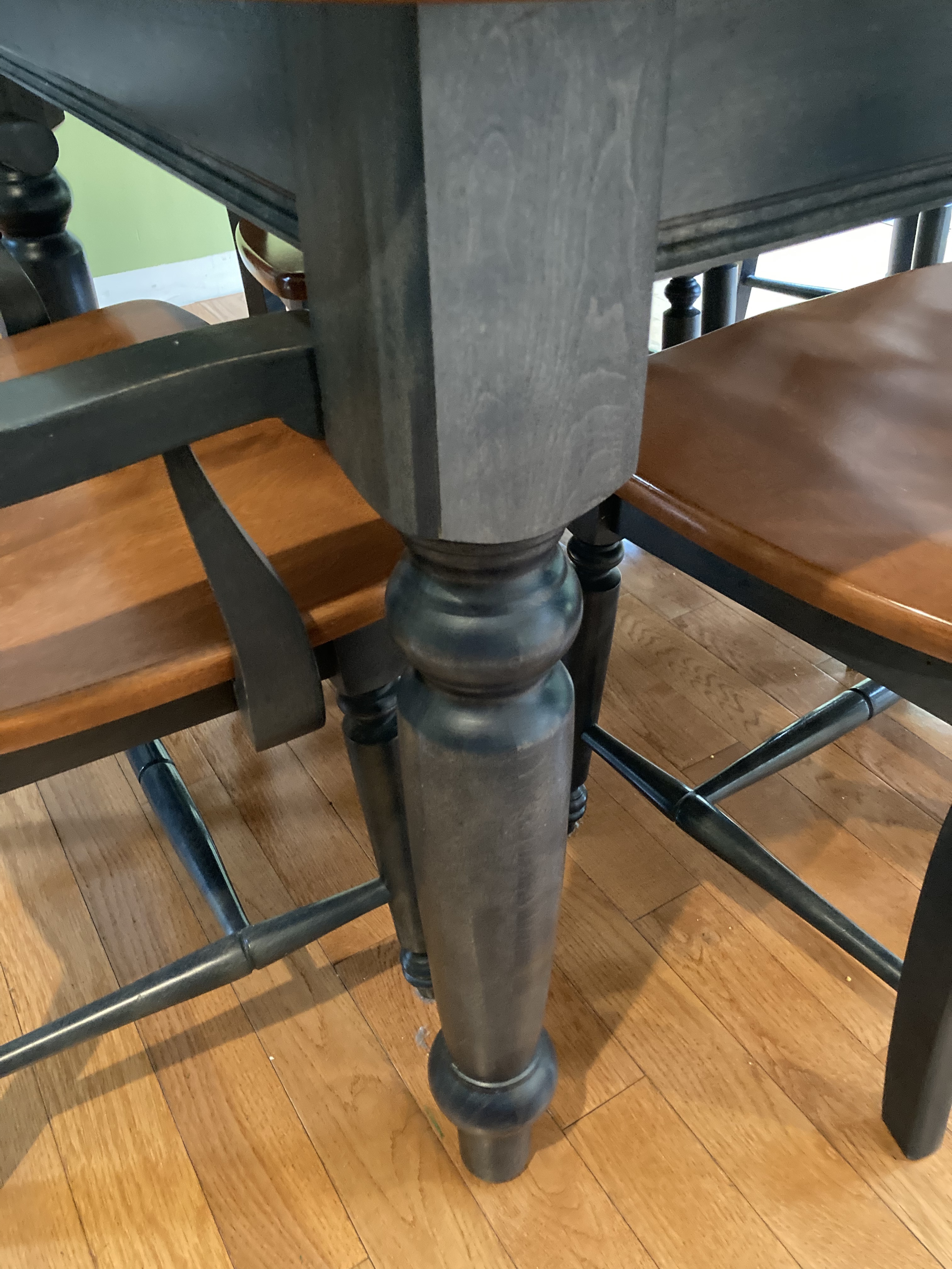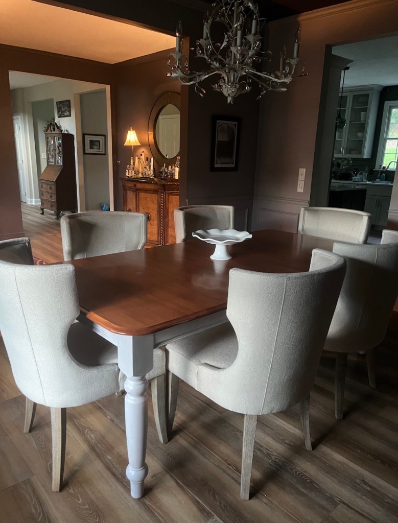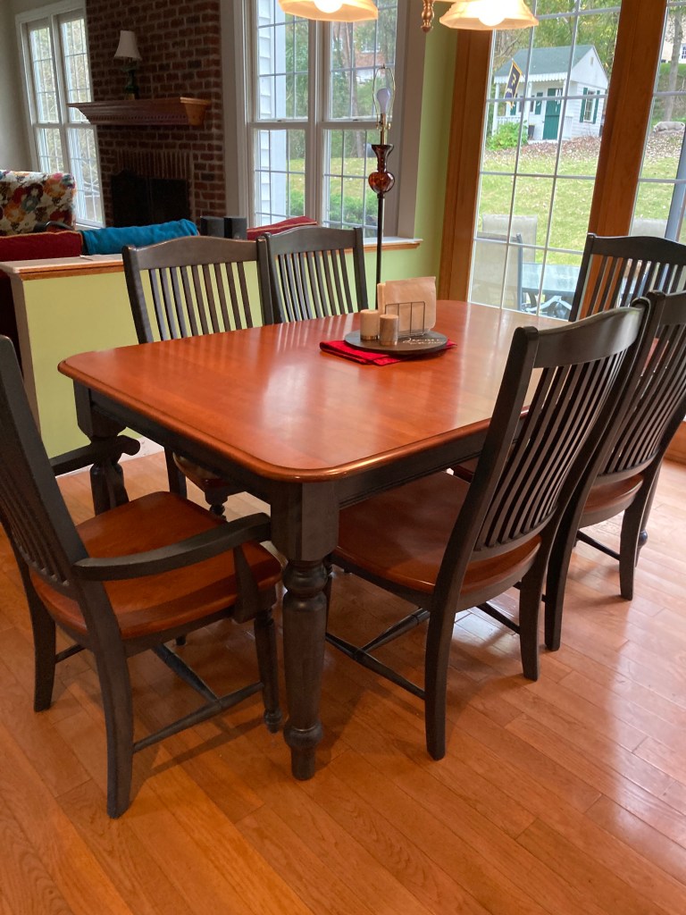 First, brainstormed a variety of ideas for an updated table finish to coordinate with new colors and dining room chairs on order!