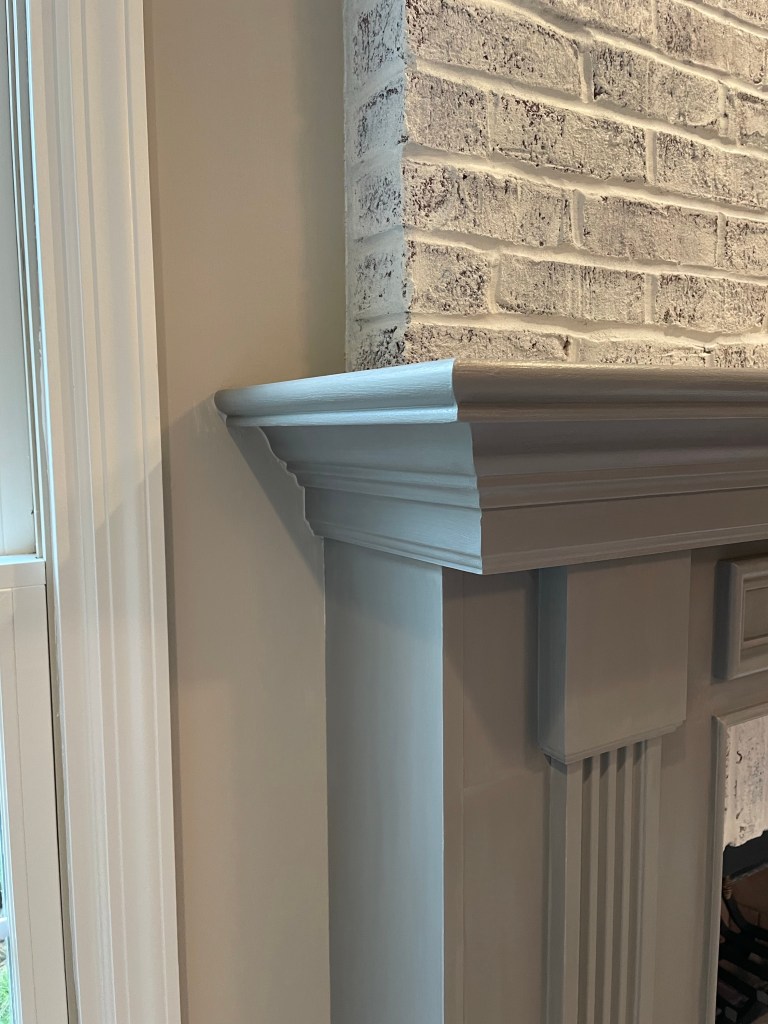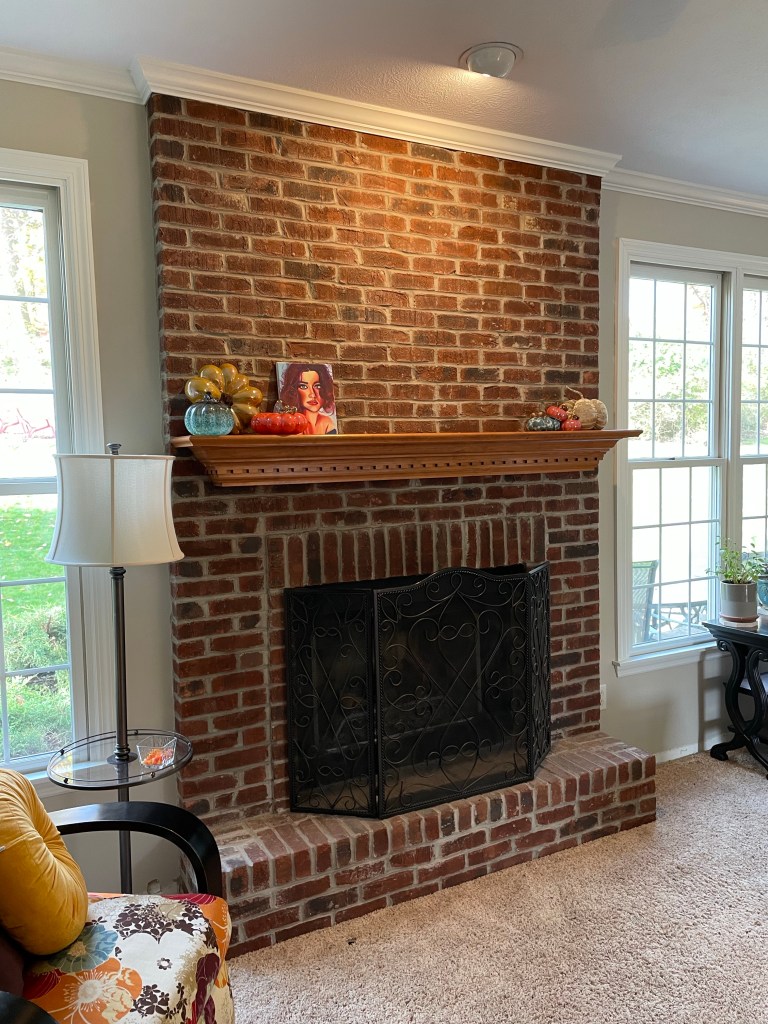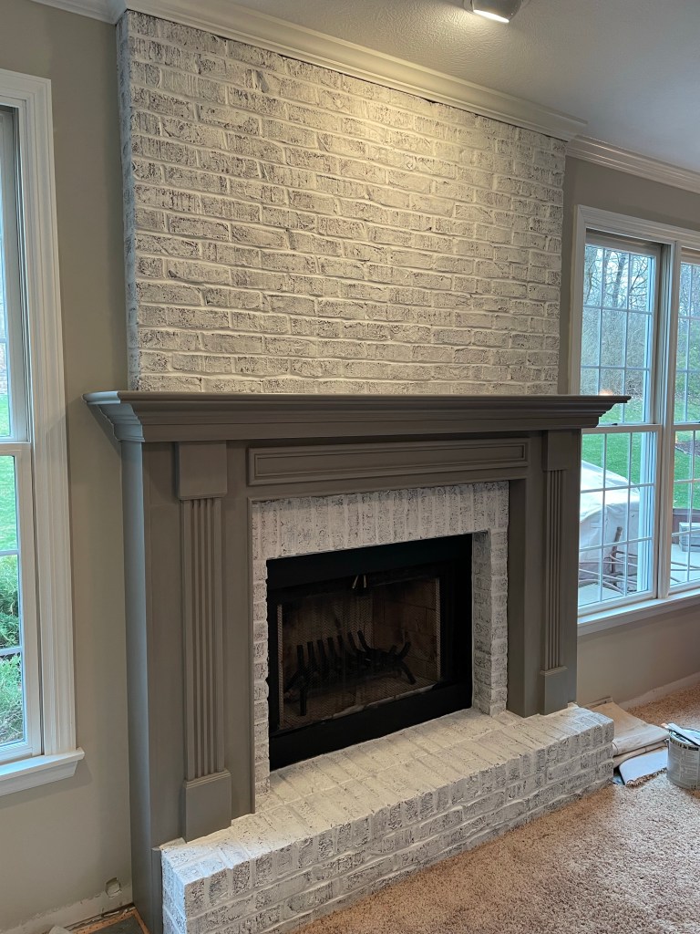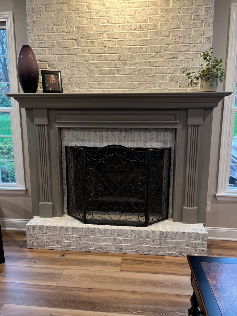 Created a custom white brick finish on this older fireplace and warmed up new custom mantel/surround with French Linen. This truly completed this beautiful family room design and renovation.