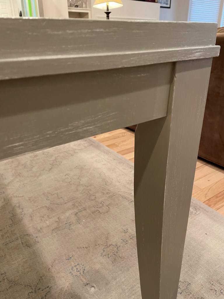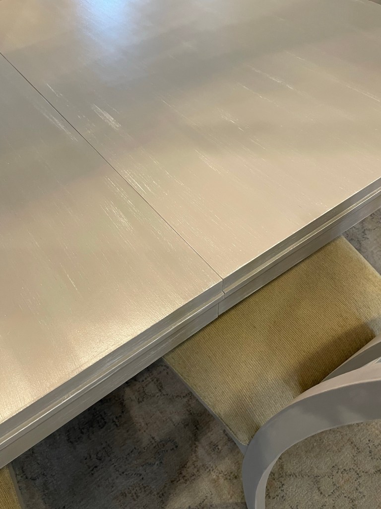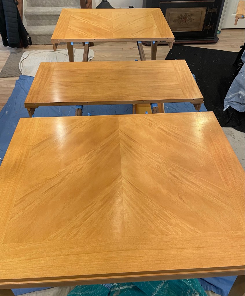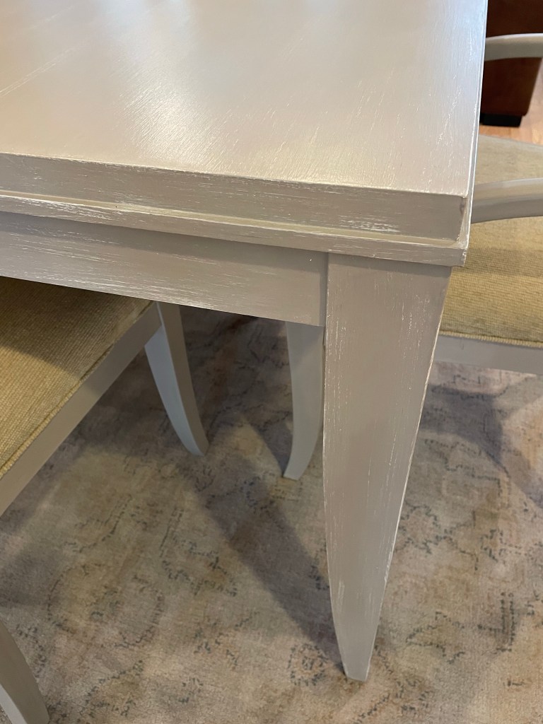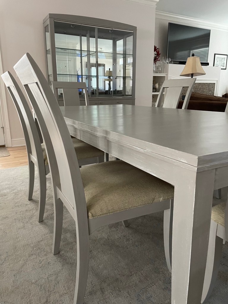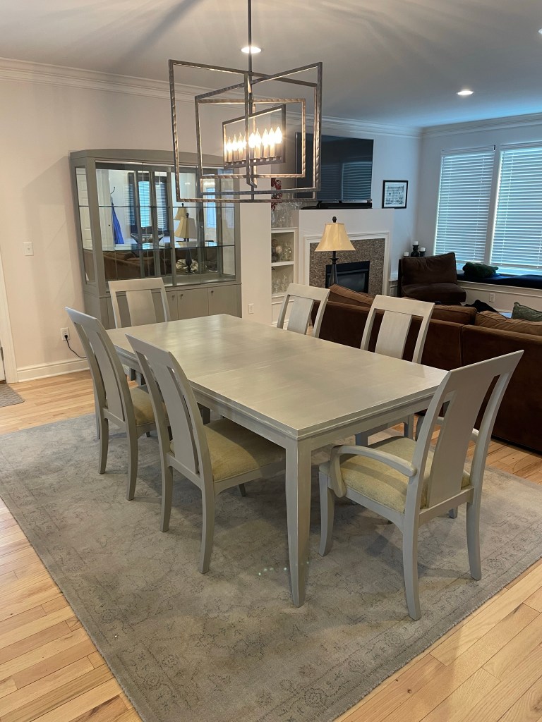 The custom finish now complements kitchen & living room colors and a new area rug coming soon. Chairs will be reupholstered in the future and these quality pieces were so worth restoring.
