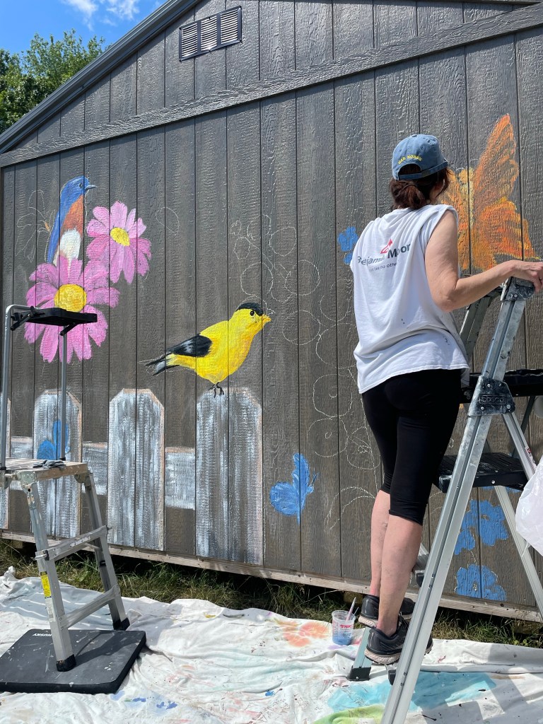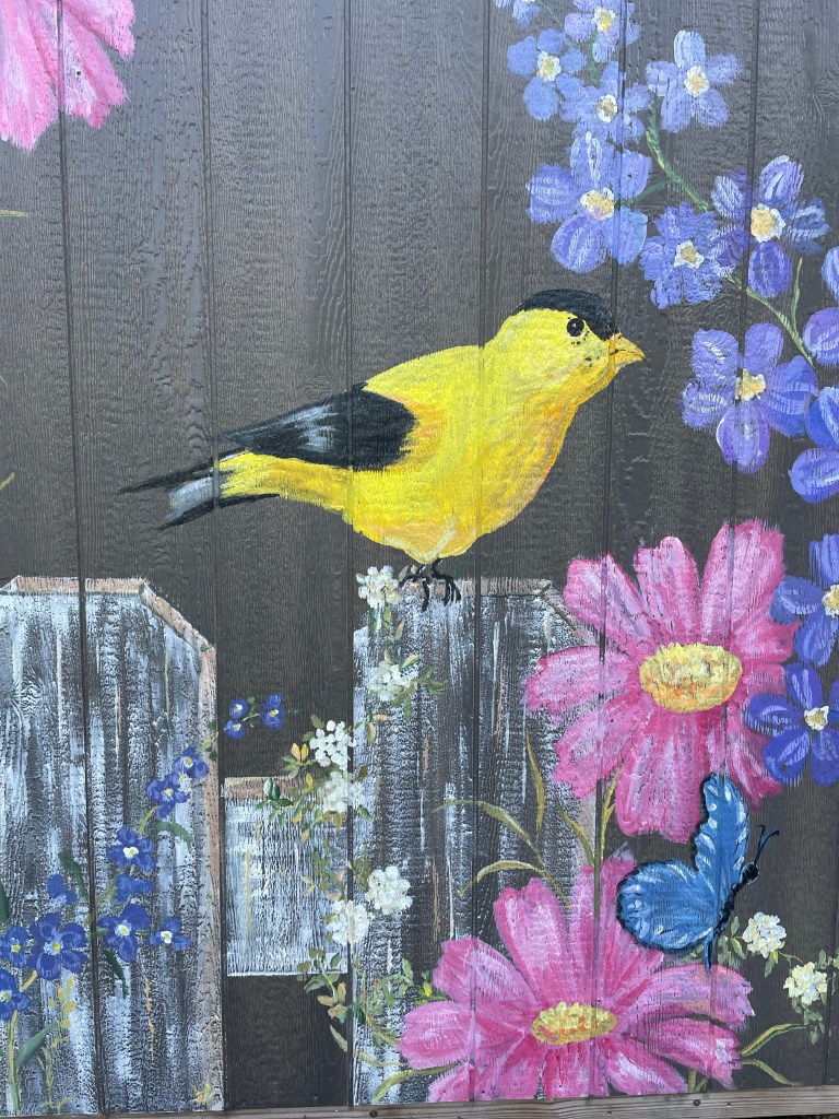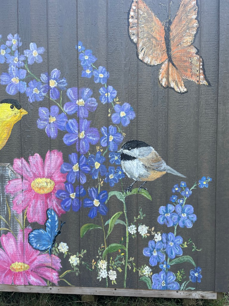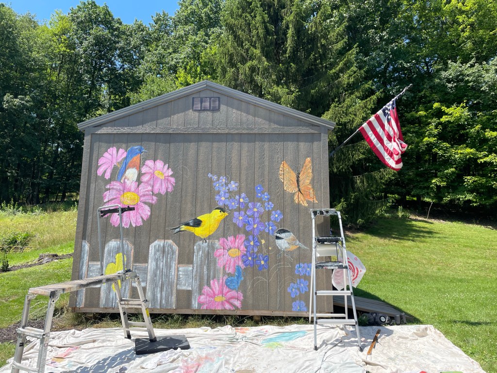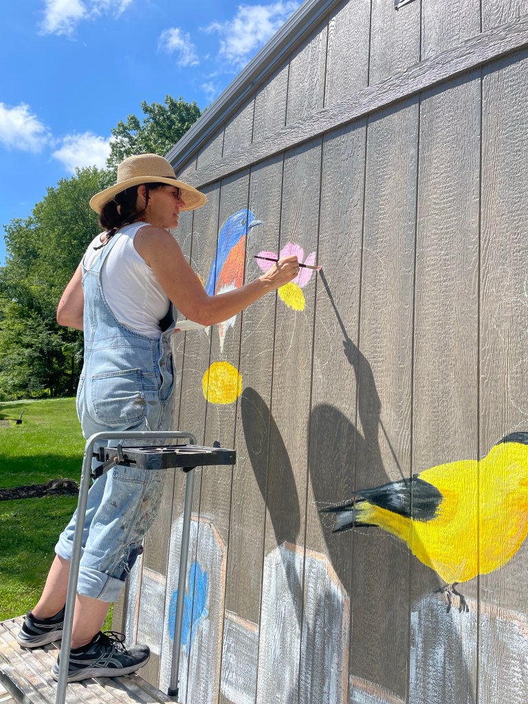 It was fun to team up on this project with my very talented artist/friend Michele! We created a mural on this shed similar to our clients’ garden flag and her favorite birds, butterflies, and flowers. Her happiness in the results made it all worth while on a very hot July summer day!