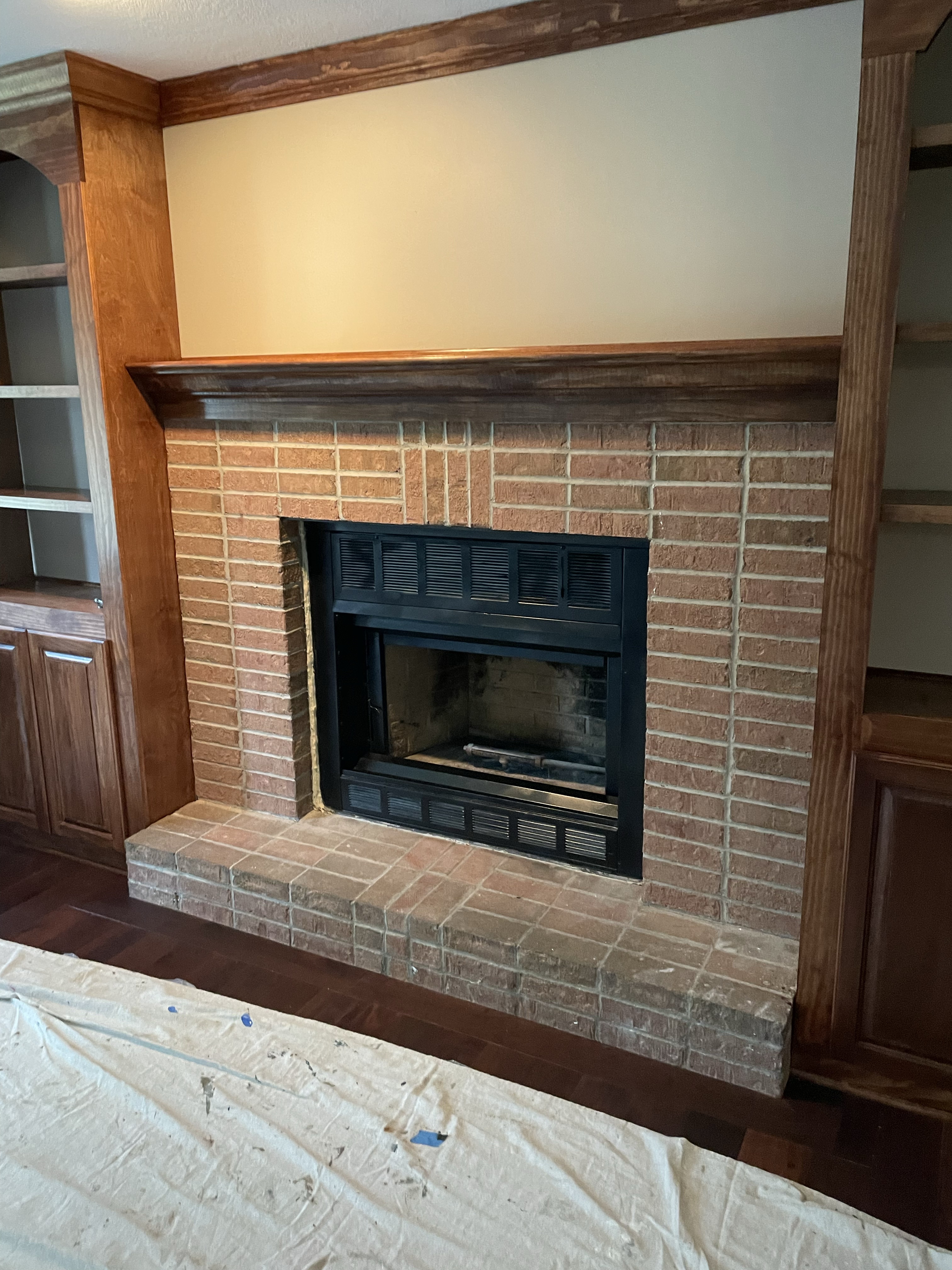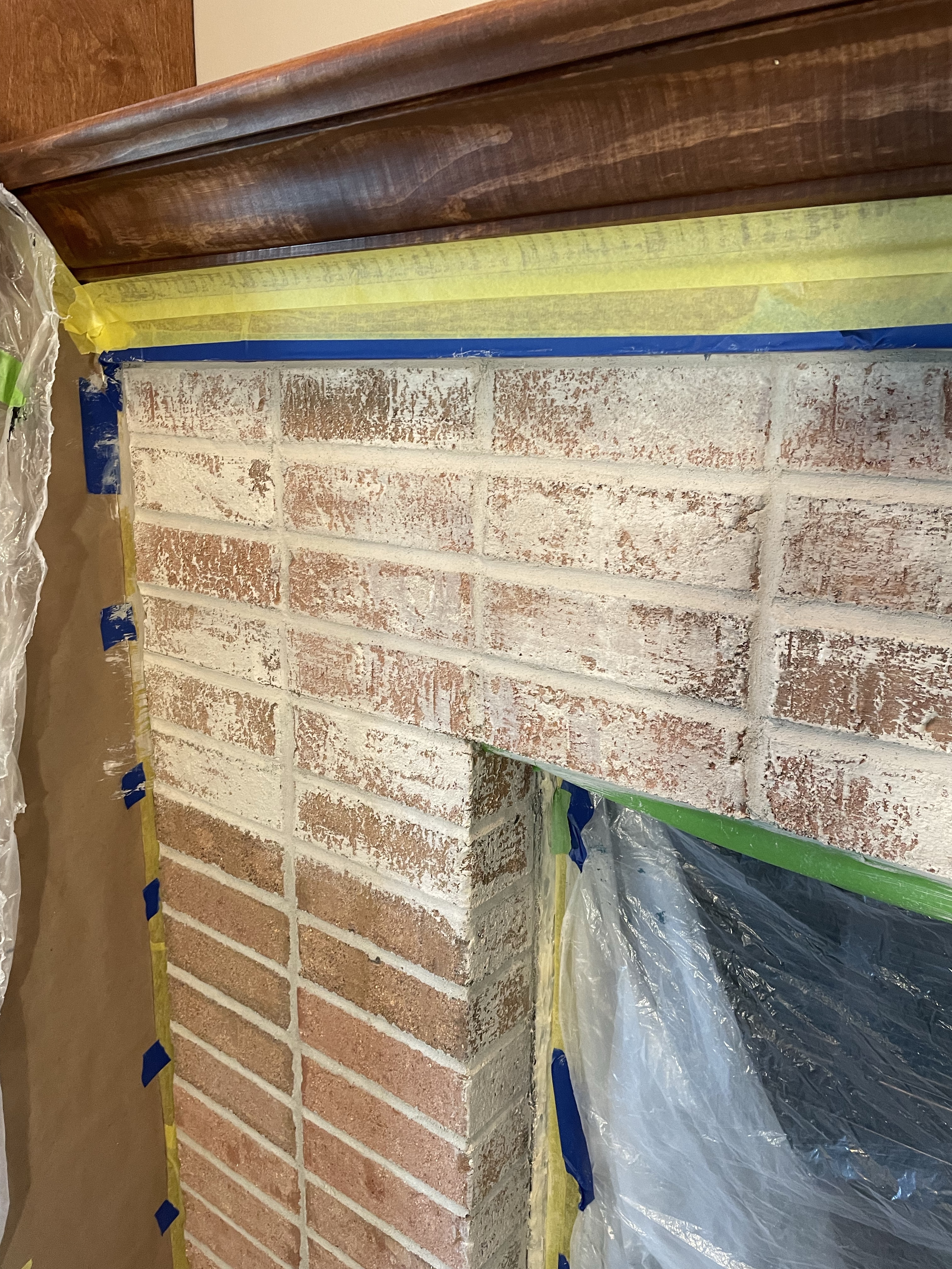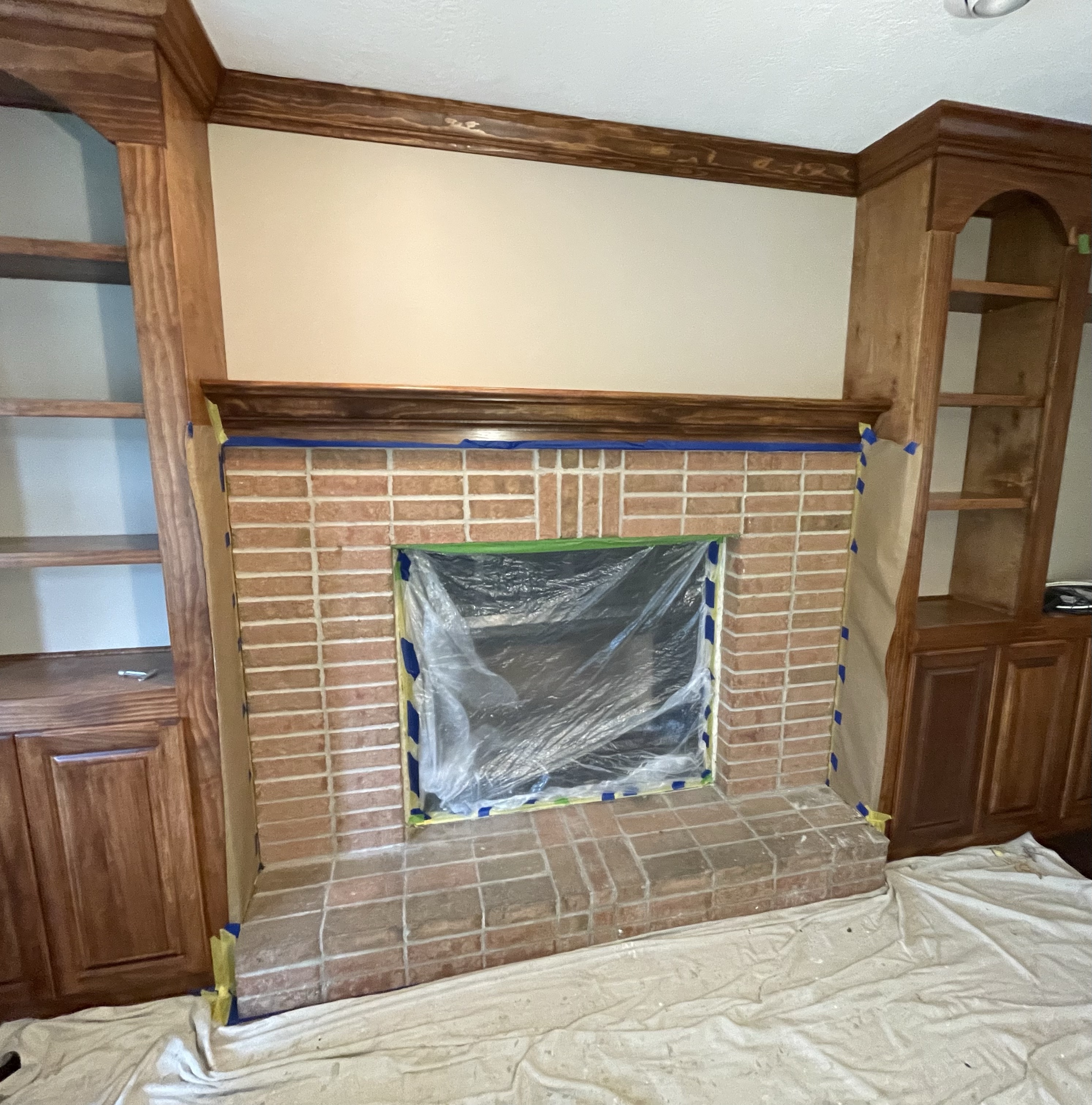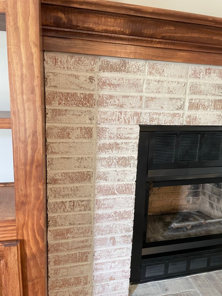 Early in the fall my neighbor/friend was doing final renovations in her home and family room. This older fireplace brick needed cleaning and a soft custom whitewashed paint finish.