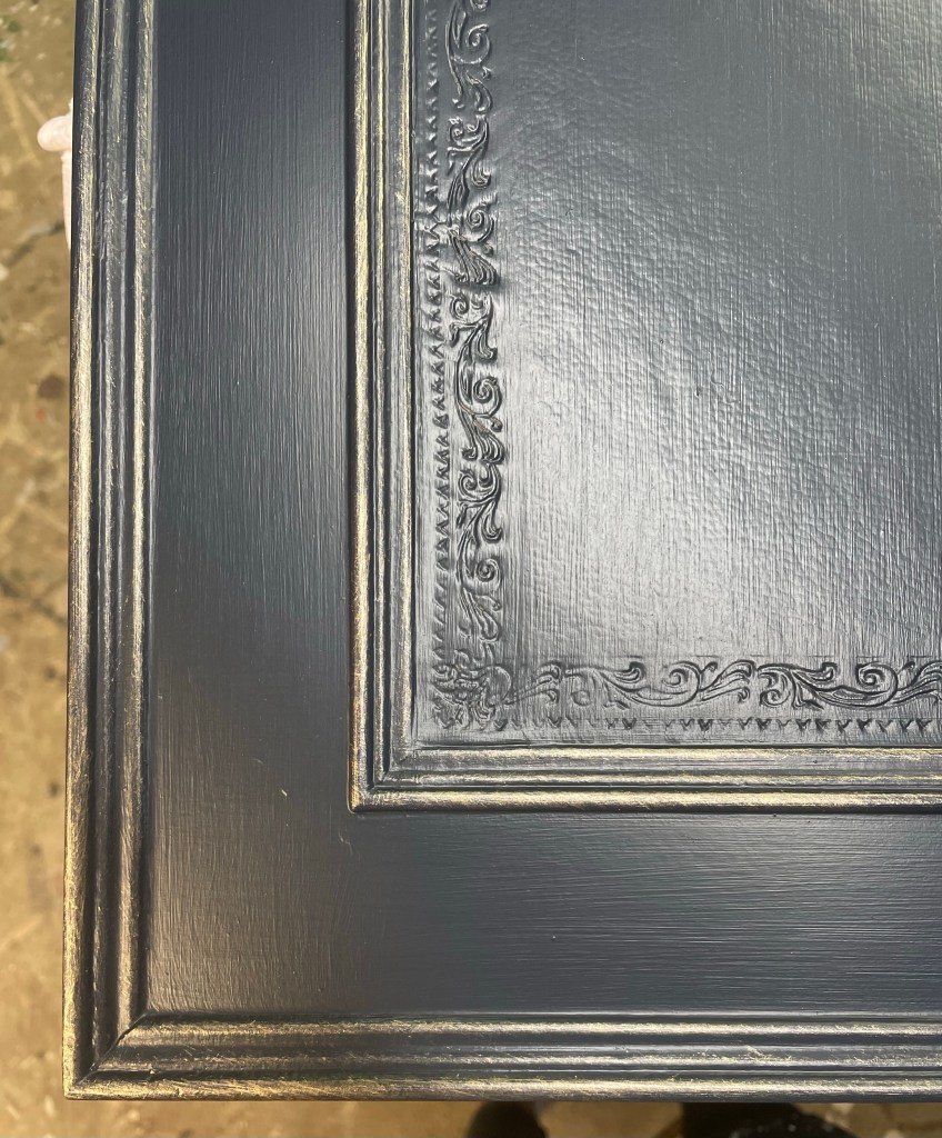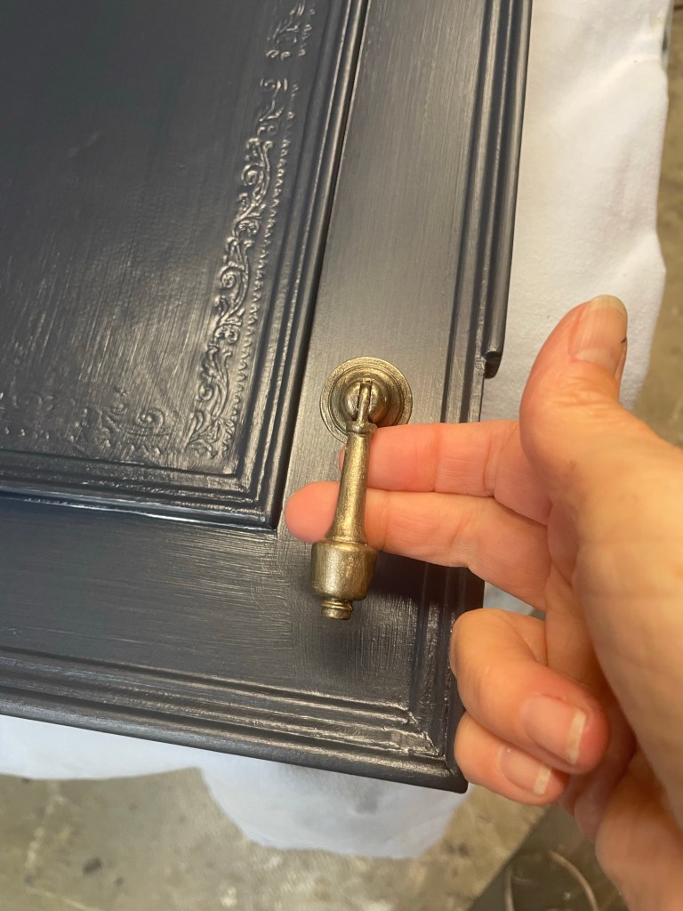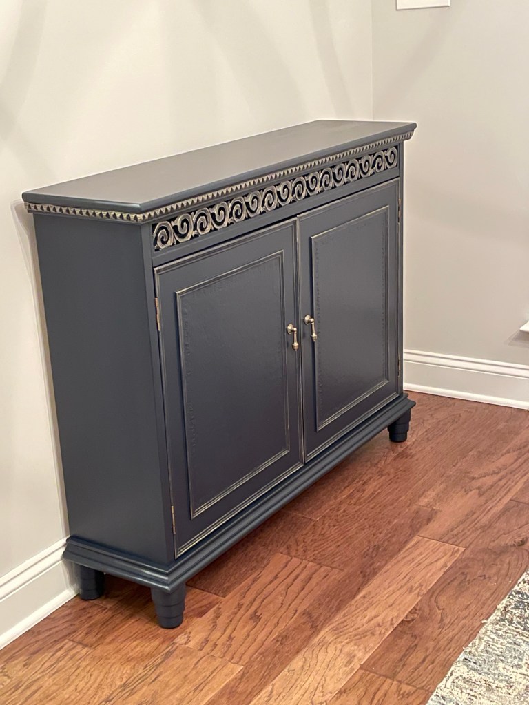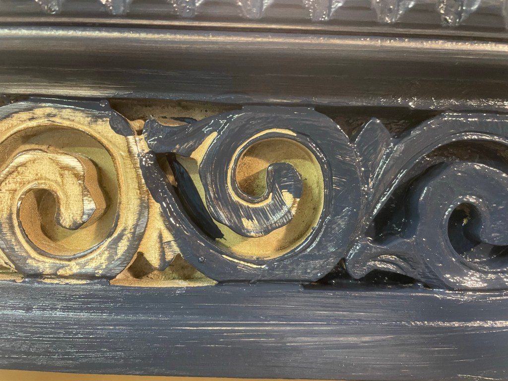 Fusion’s Midnight Navy was the perfect choice and it’s a charming, stunning, modernizing color! Champagne gold metallic was painted onto carved details, original hinges, and door pulls.