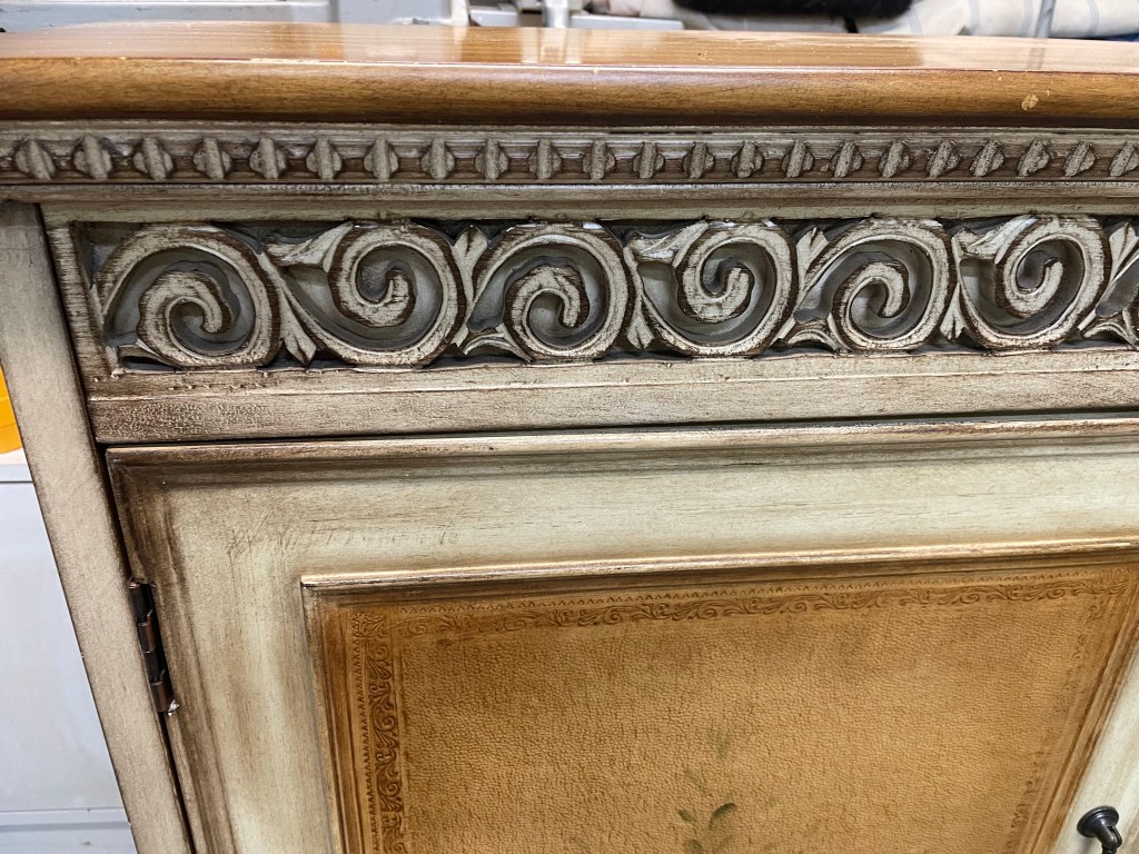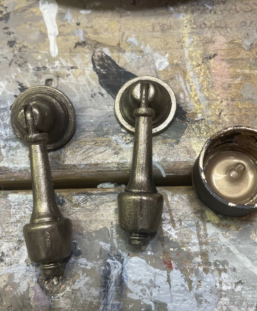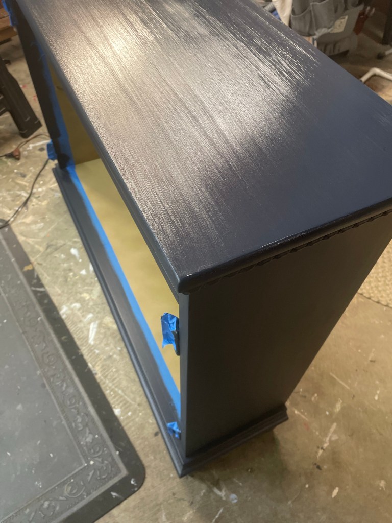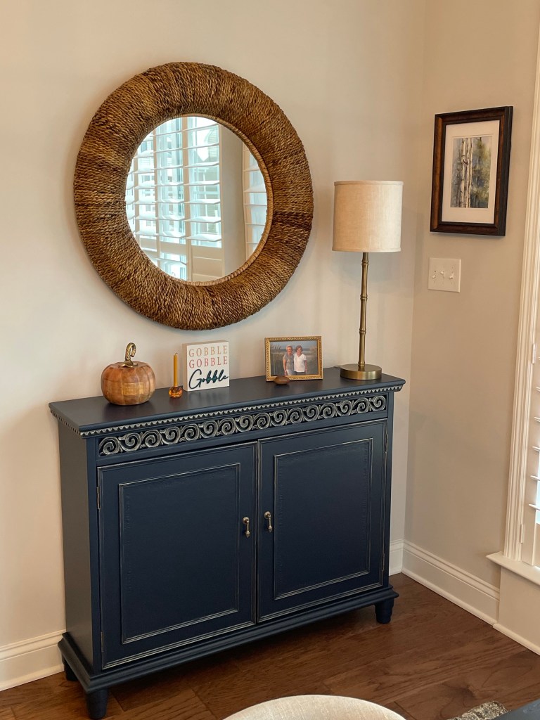 Fusion’s Midnight Navy was the perfect choice and it’s a charming, stunning, modernizing color! Champagne gold metallic was painted onto carved details, original hinges, and door pulls.
