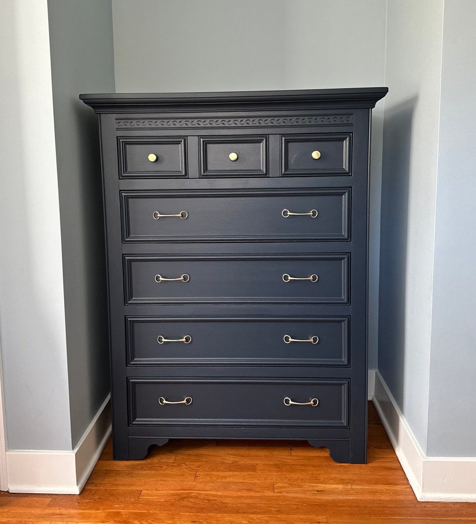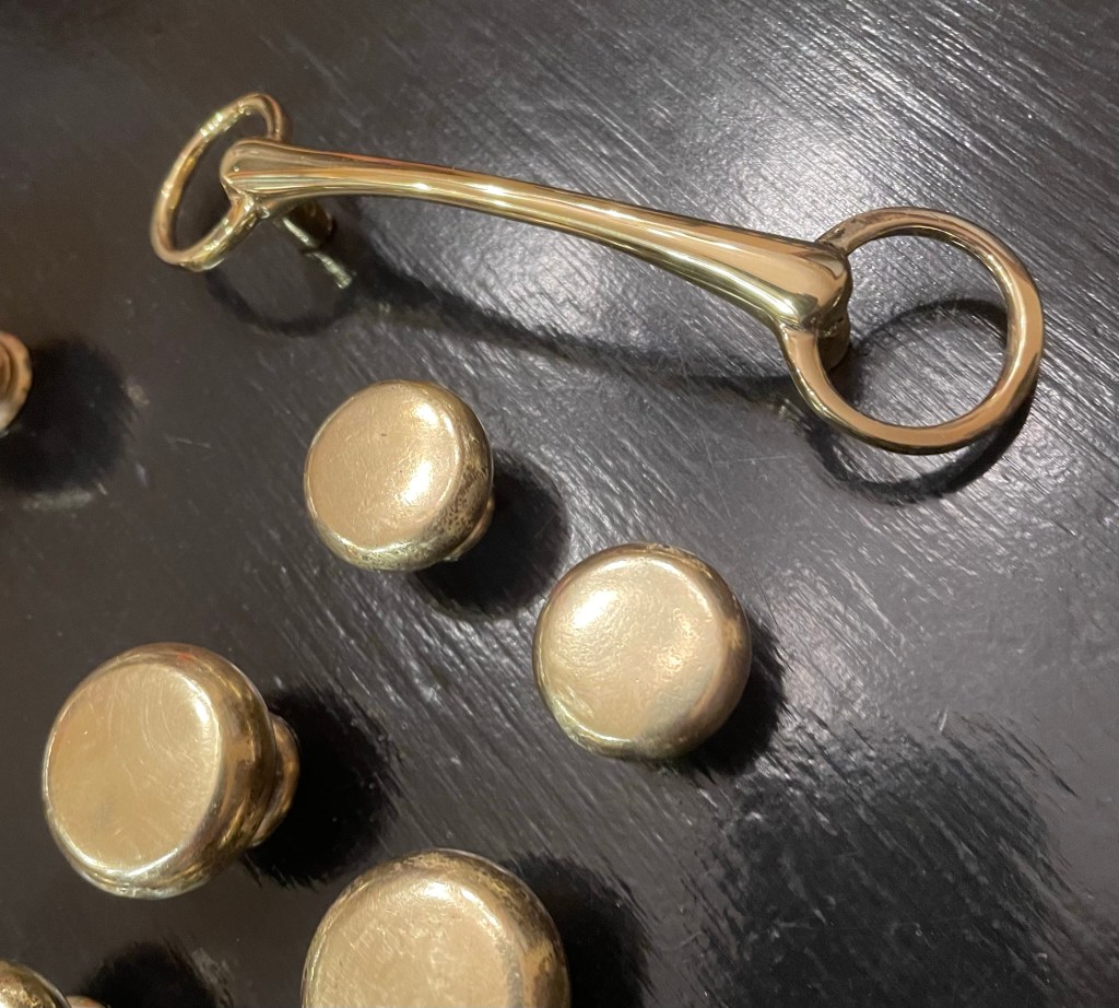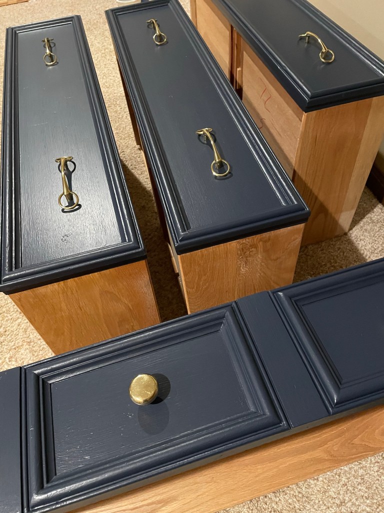 Another fun detail was cleaning/polishing all the old brass knobs to coordinate with new equestrian bit pulls. My client’s daughter loves horses and is a great rider like her mom and grandmother. Originally I was going to custom paint knobs but the sheen would not have matched. Love how these quality brass knobs came back to life and the new Midnight Navy paint color is truly stunning!
