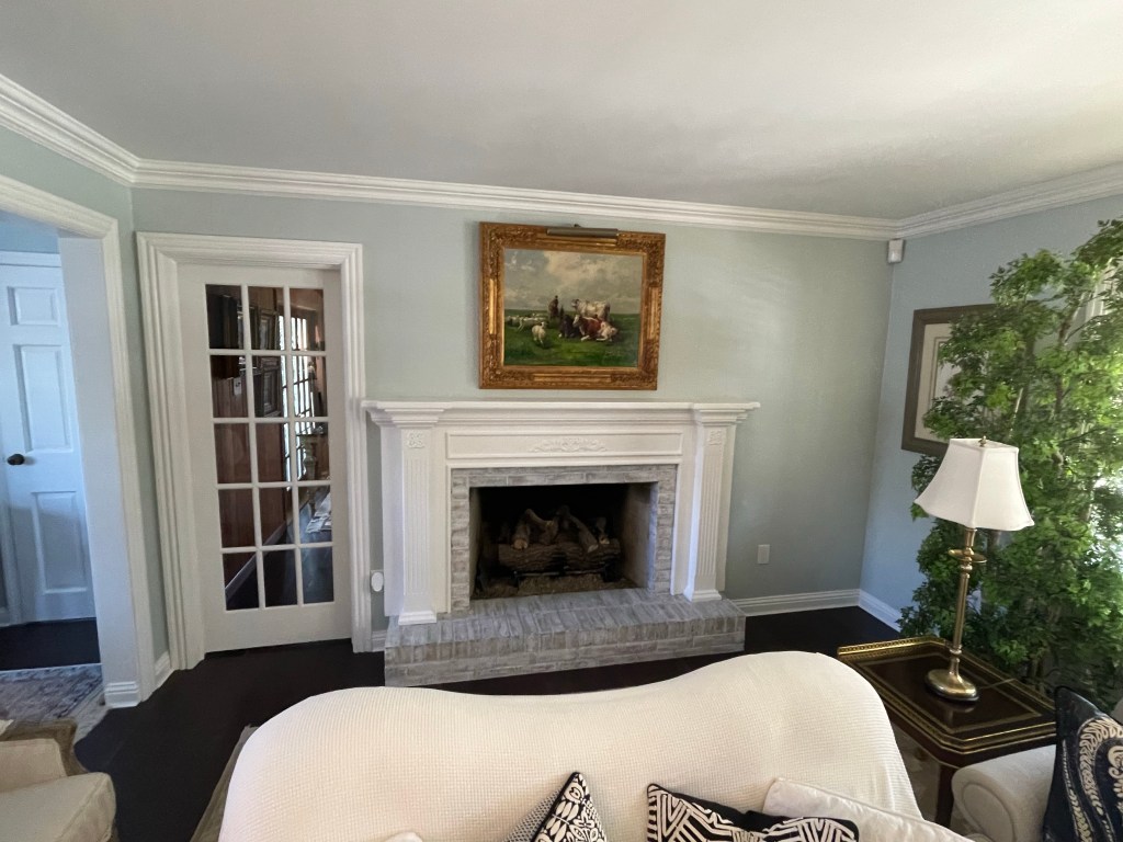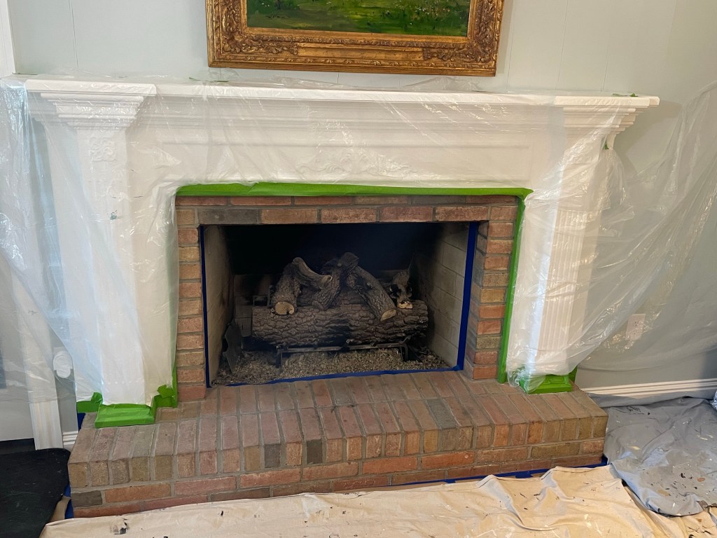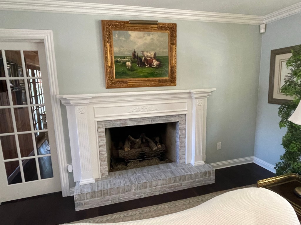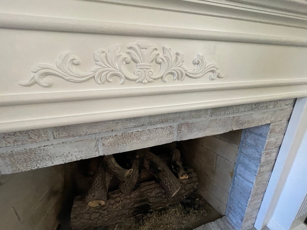 This fireplace brick just needed an update in a creamy whitewash and truly it brightens up the living room and space! Modernized and now shows off the beautiful artwork above!