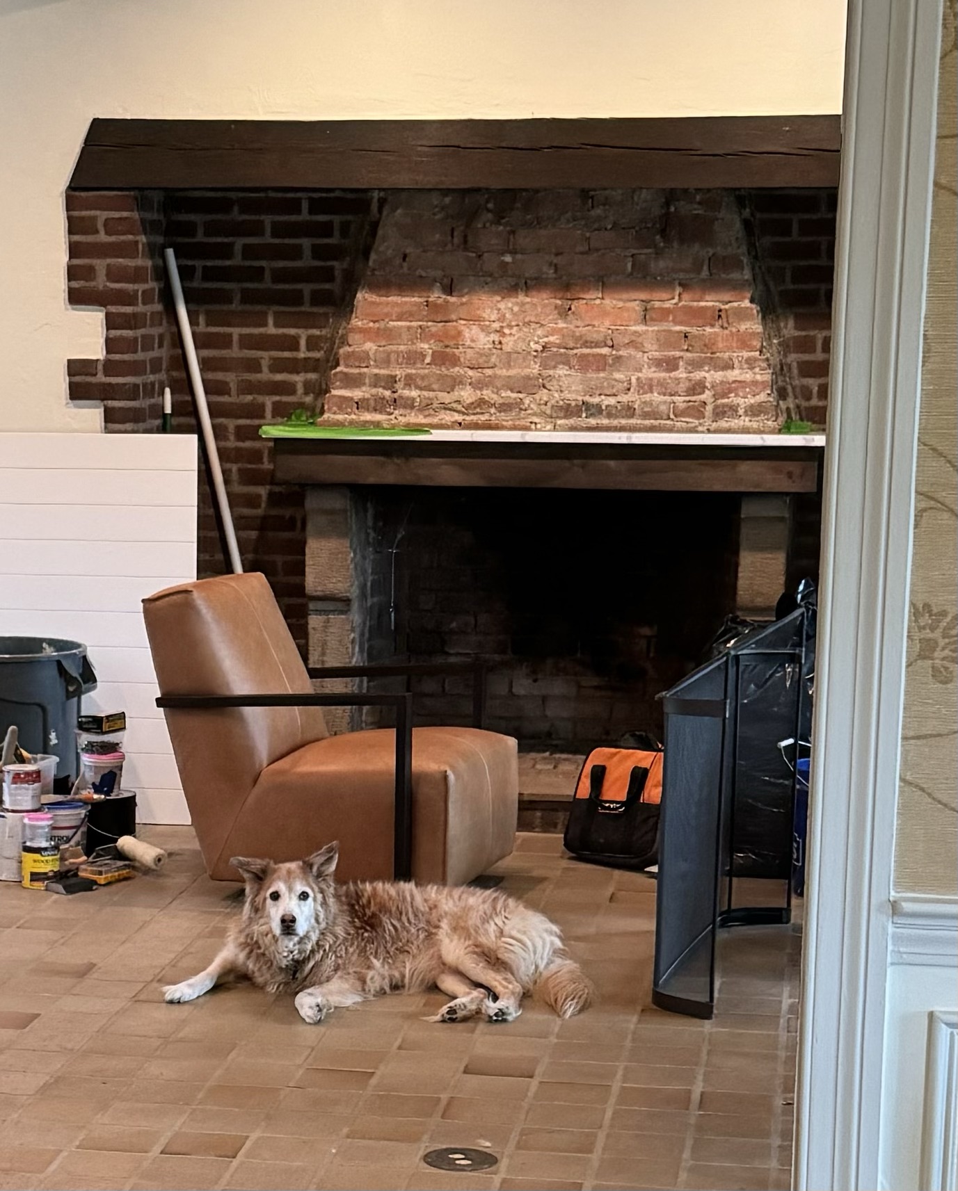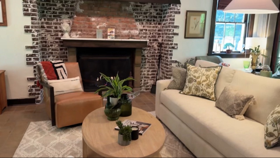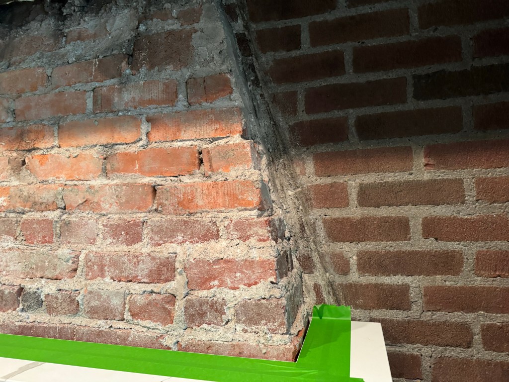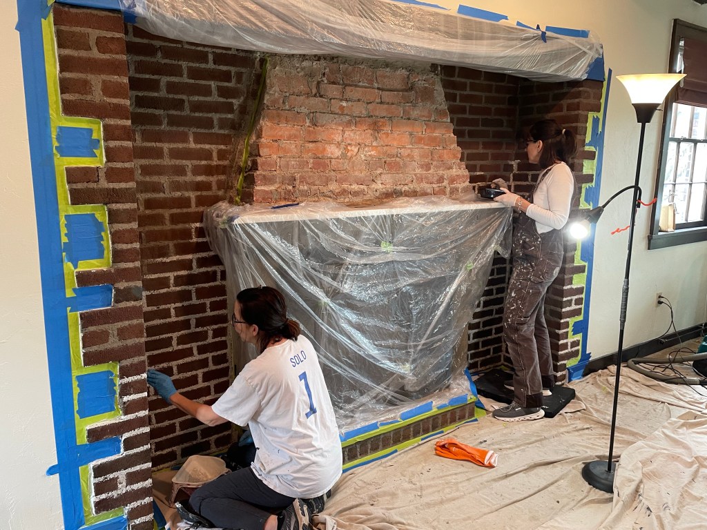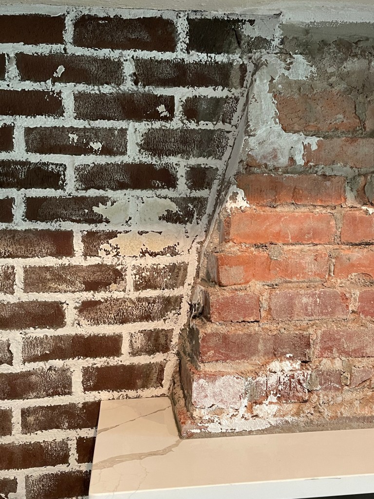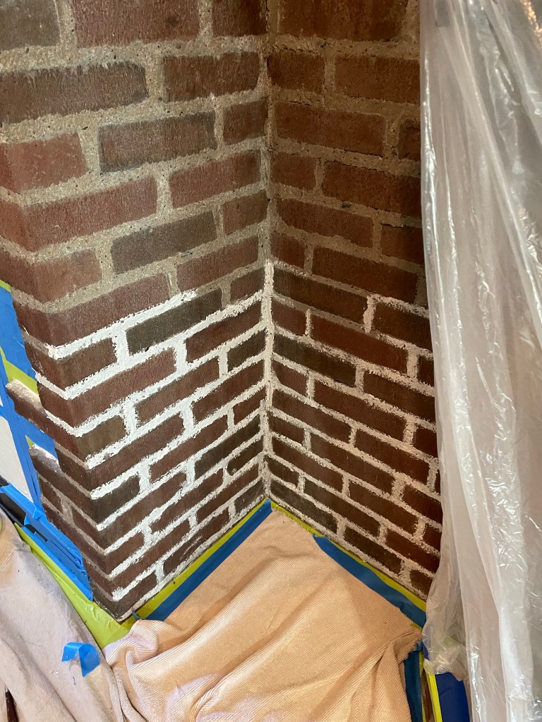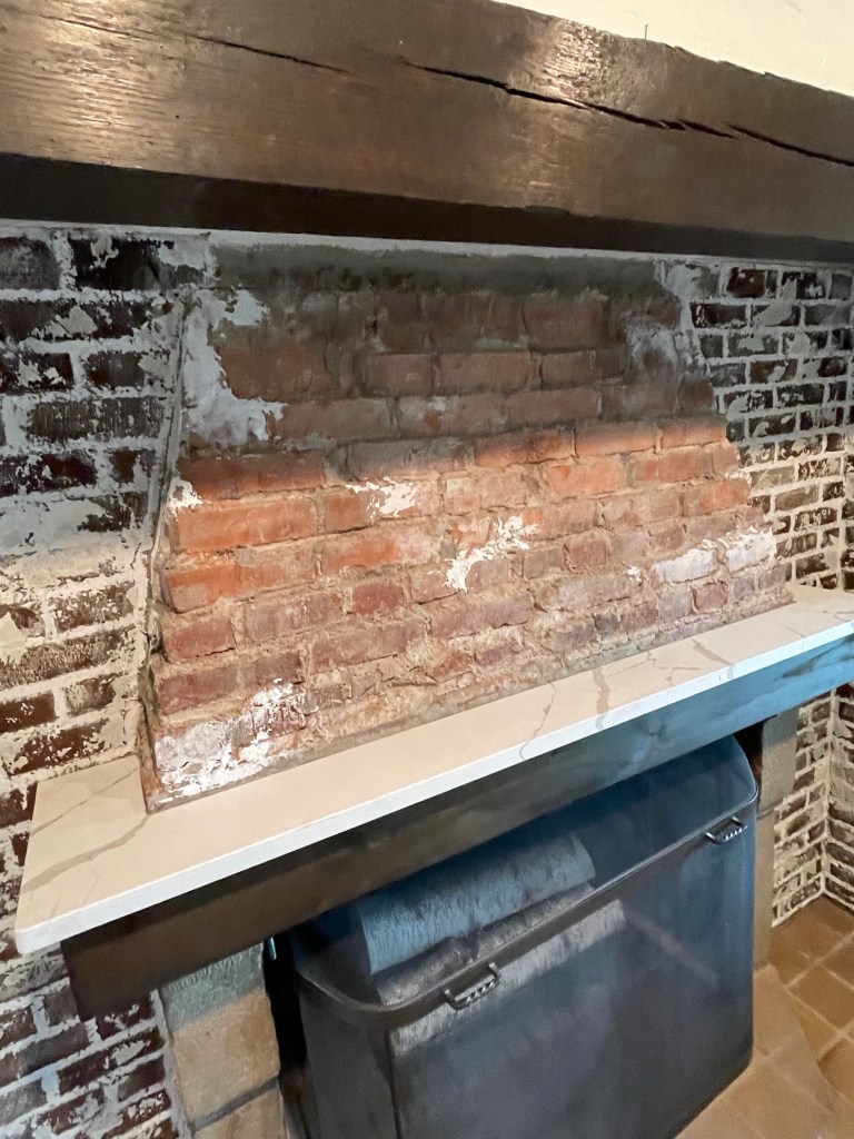 Some repointing work was done ahead on the old mortar so it could be more protected before we painted on the plaster. This new finish truly softened the room and works nicely with the ceiling beams as well.