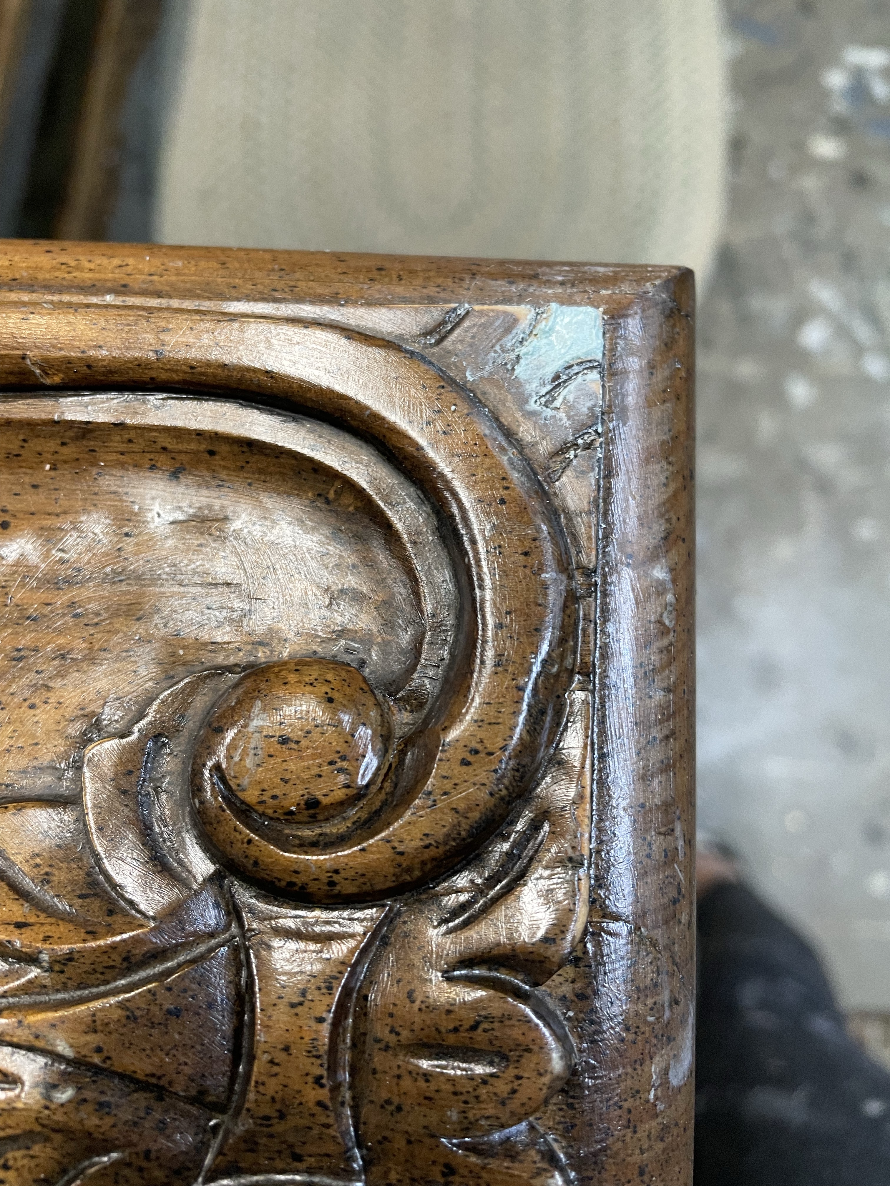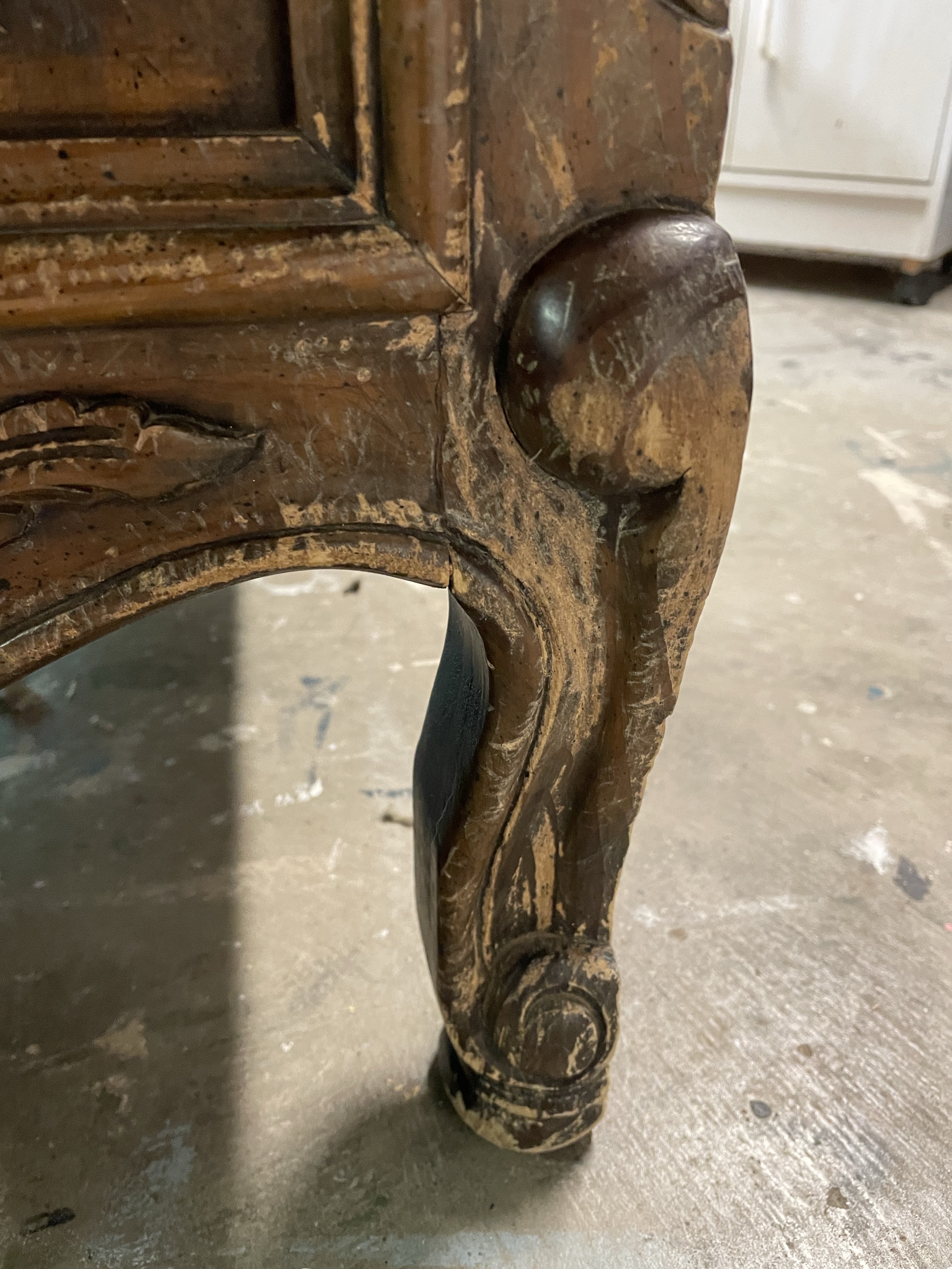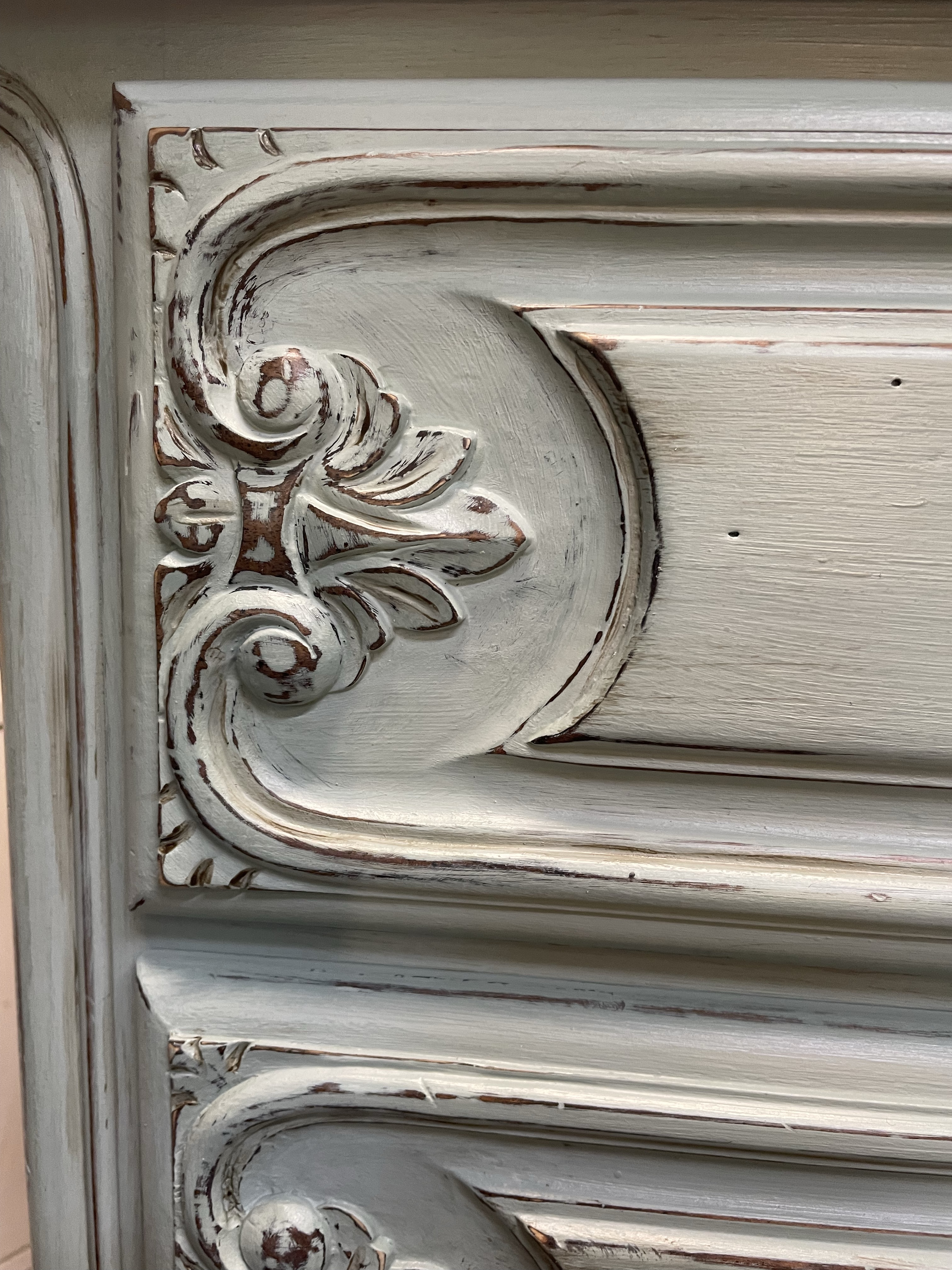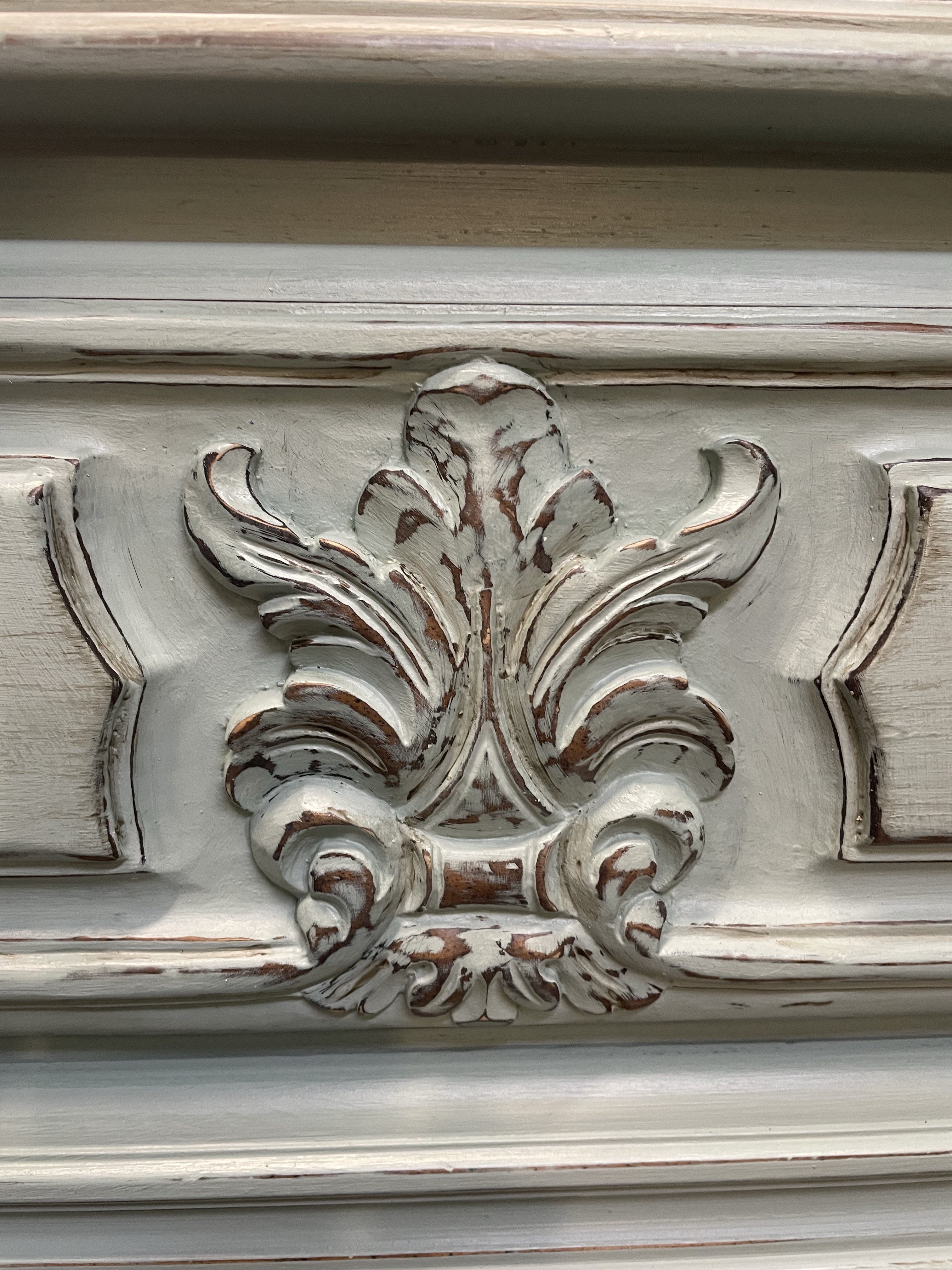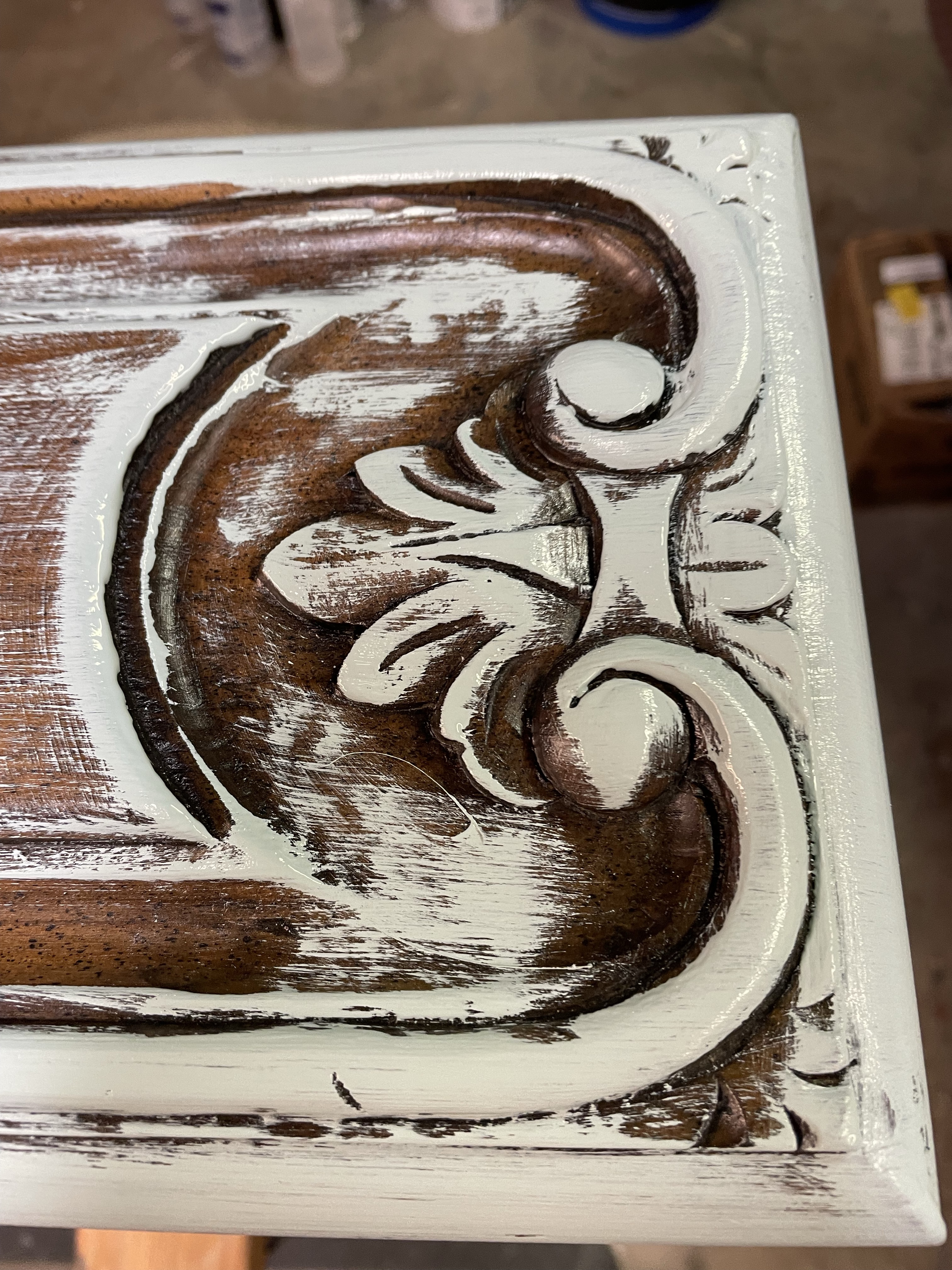I absolutely loved seeing the transformation as I painted. I knew distressing the wood carvings were important to help with dimensions and to show off the beautiful details before glazing!
