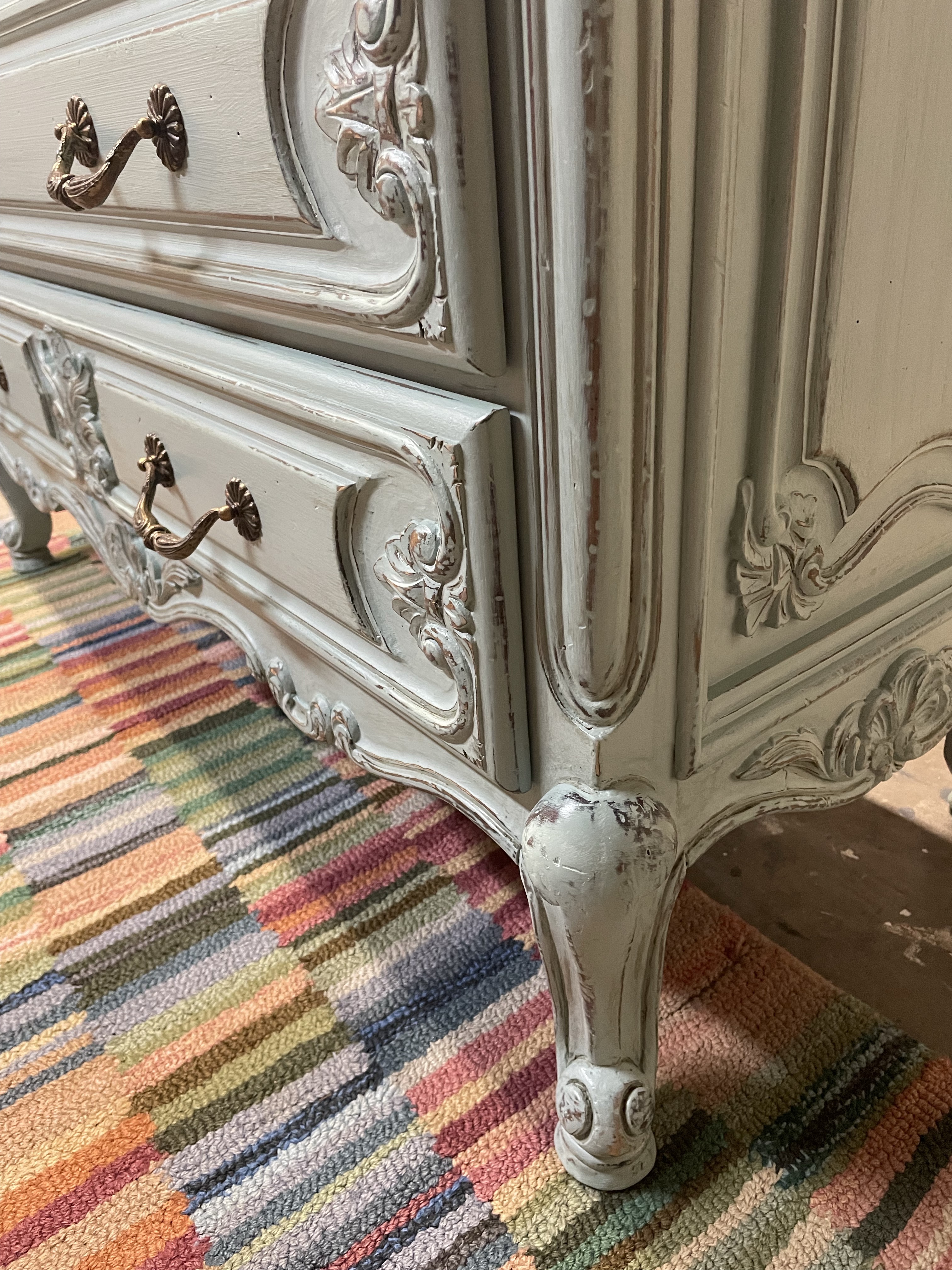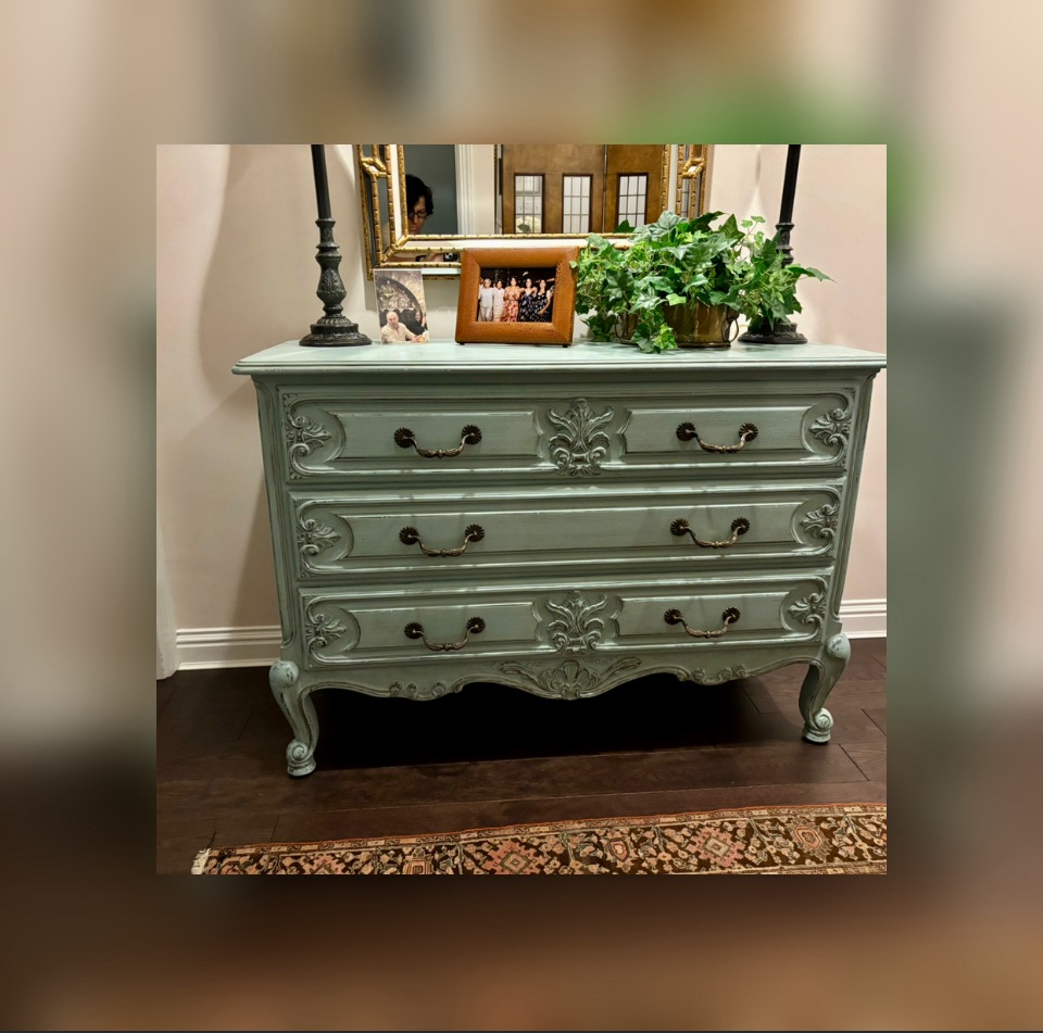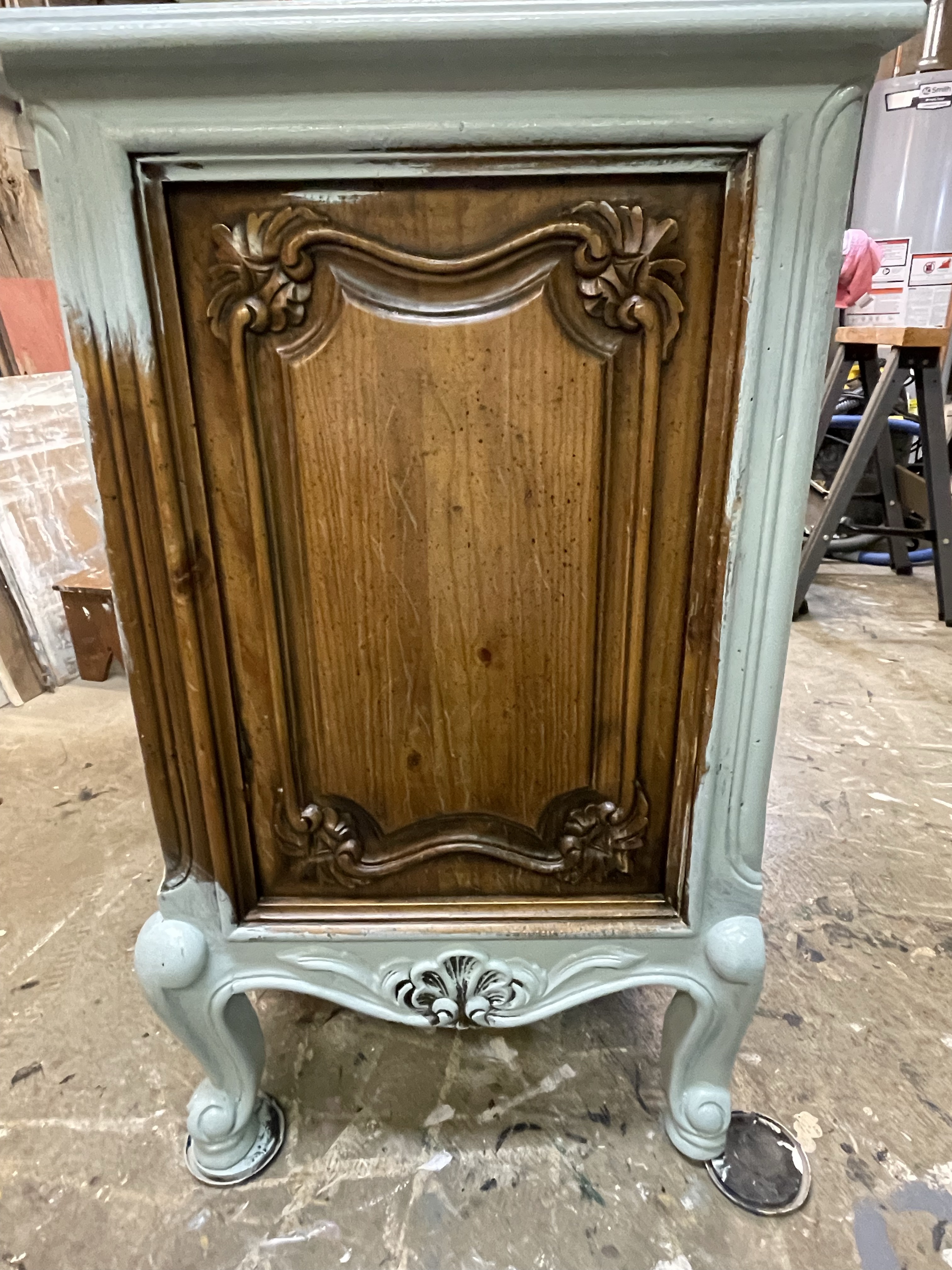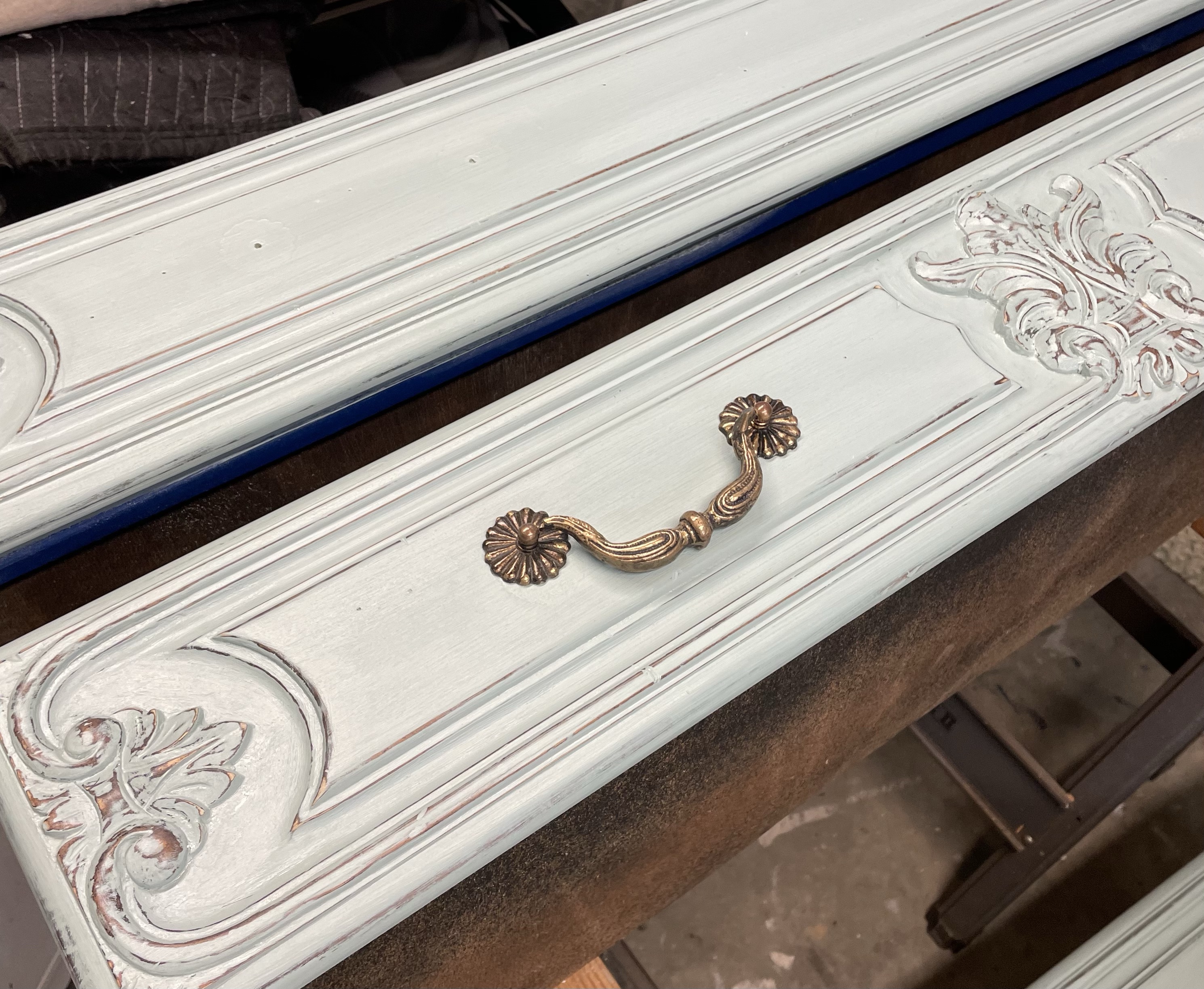 I worked on this fun piece in my shop this past June and loved painting with Annie Sloan’s Duck Egg, a color I had always loved and had never used before.