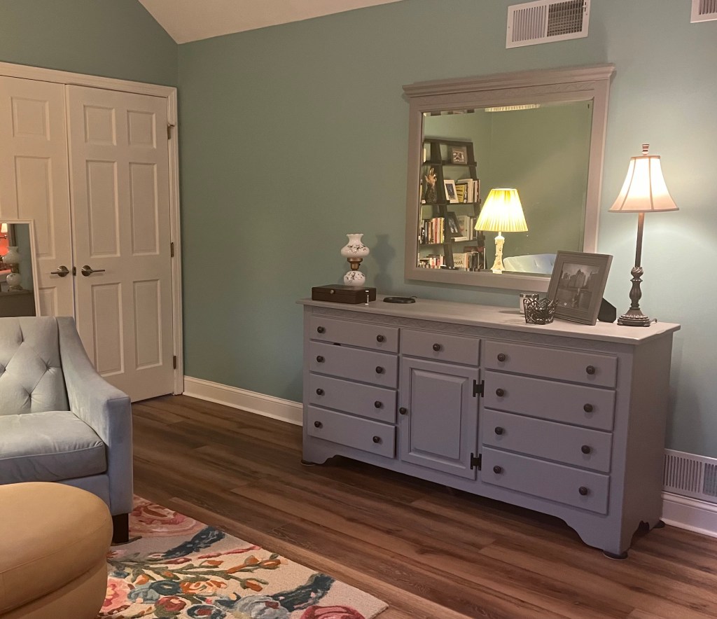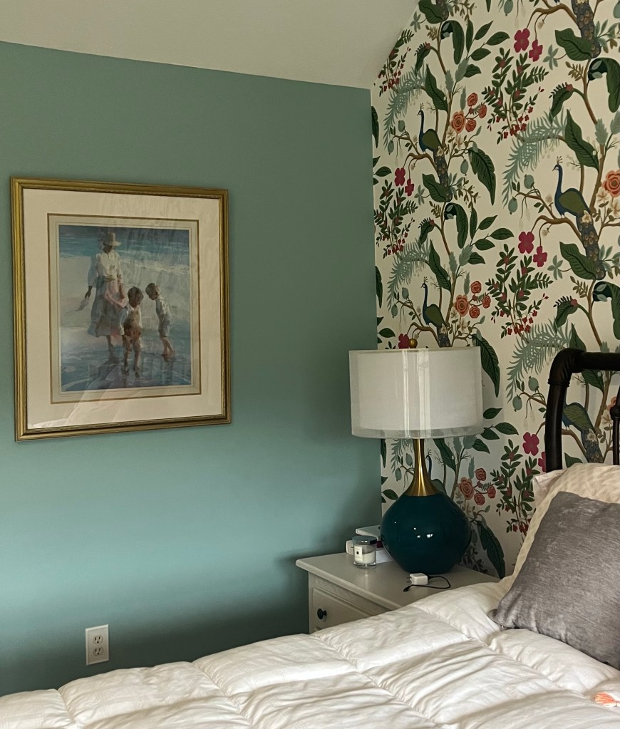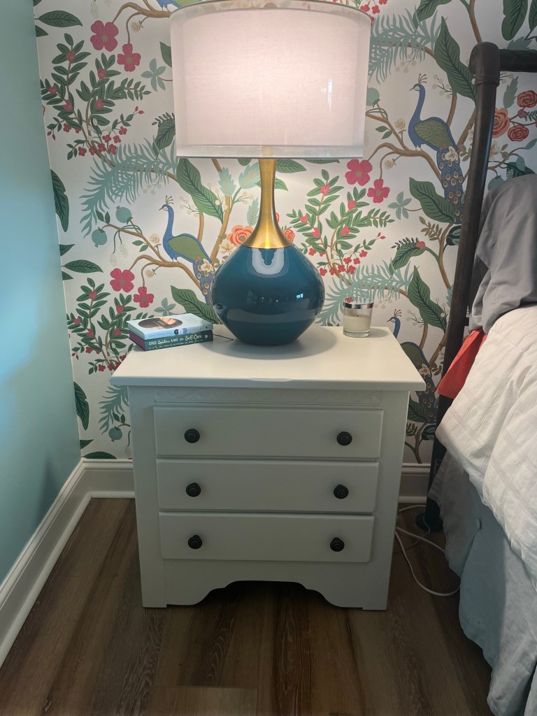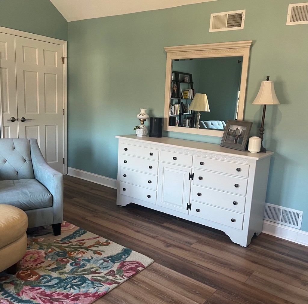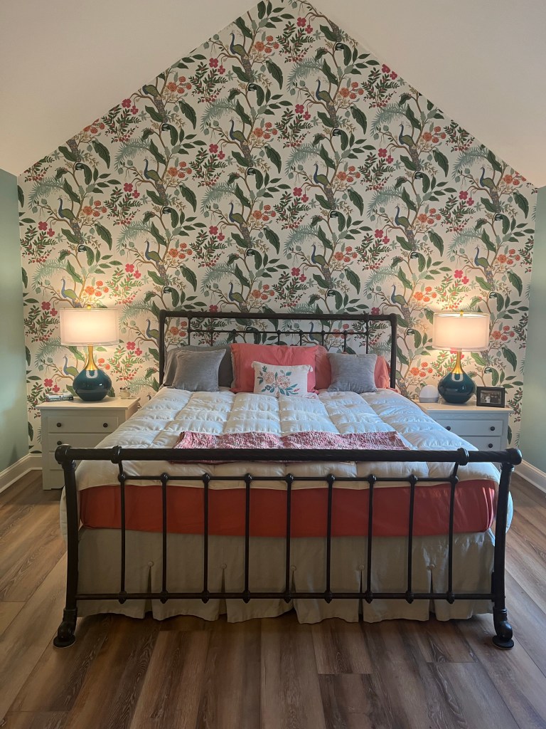 Together we brainstormed finishes for this bedroom furniture to coordinate with her amazing new wallpaper, walls, area rug, and flooring!