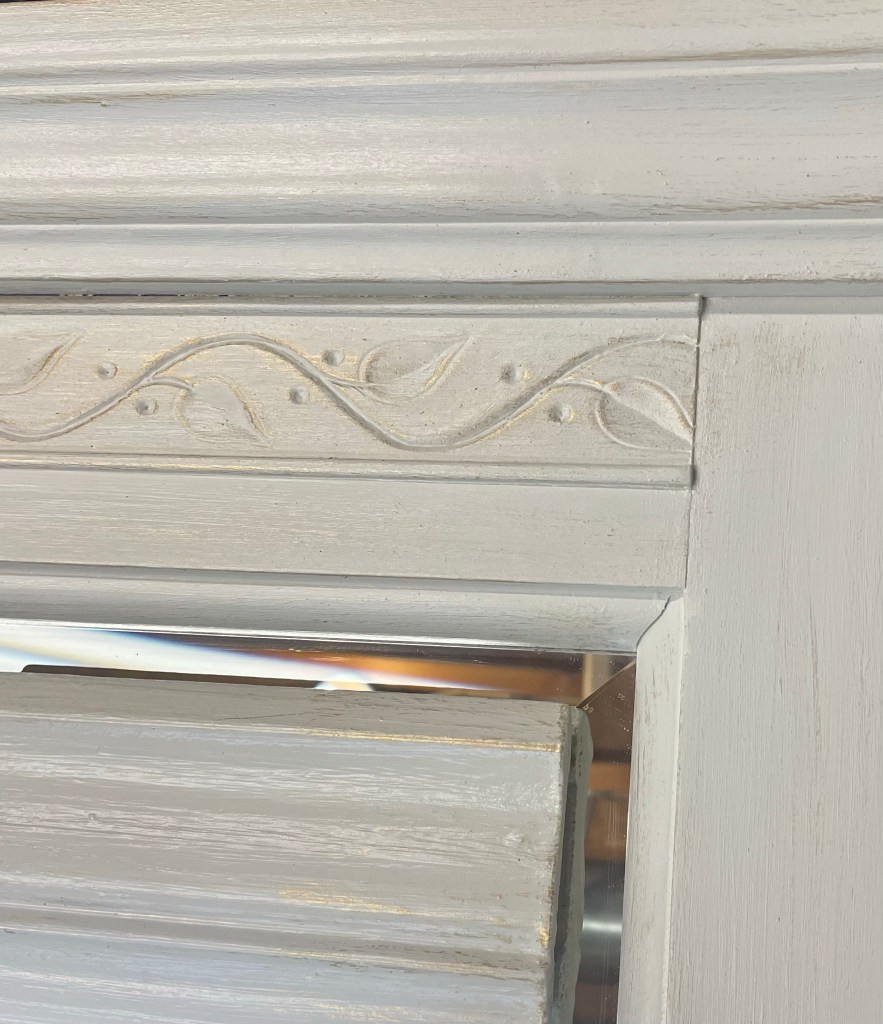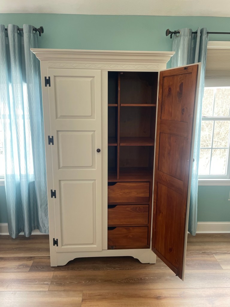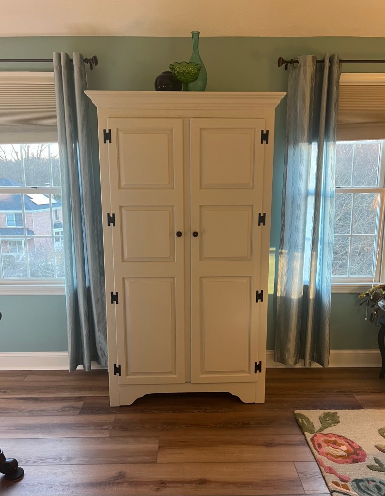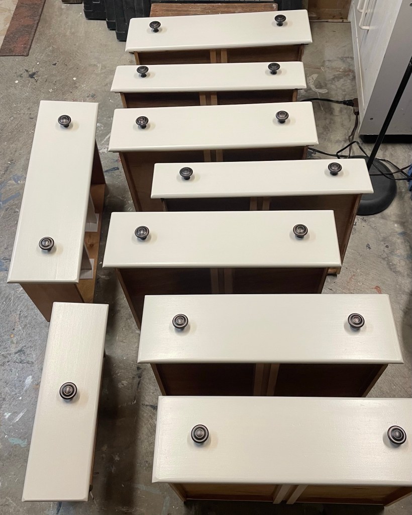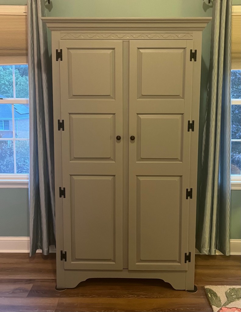 Together we brainstormed finishes for this bedroom furniture to coordinate with her amazing new wallpaper, walls, area rug, and flooring!