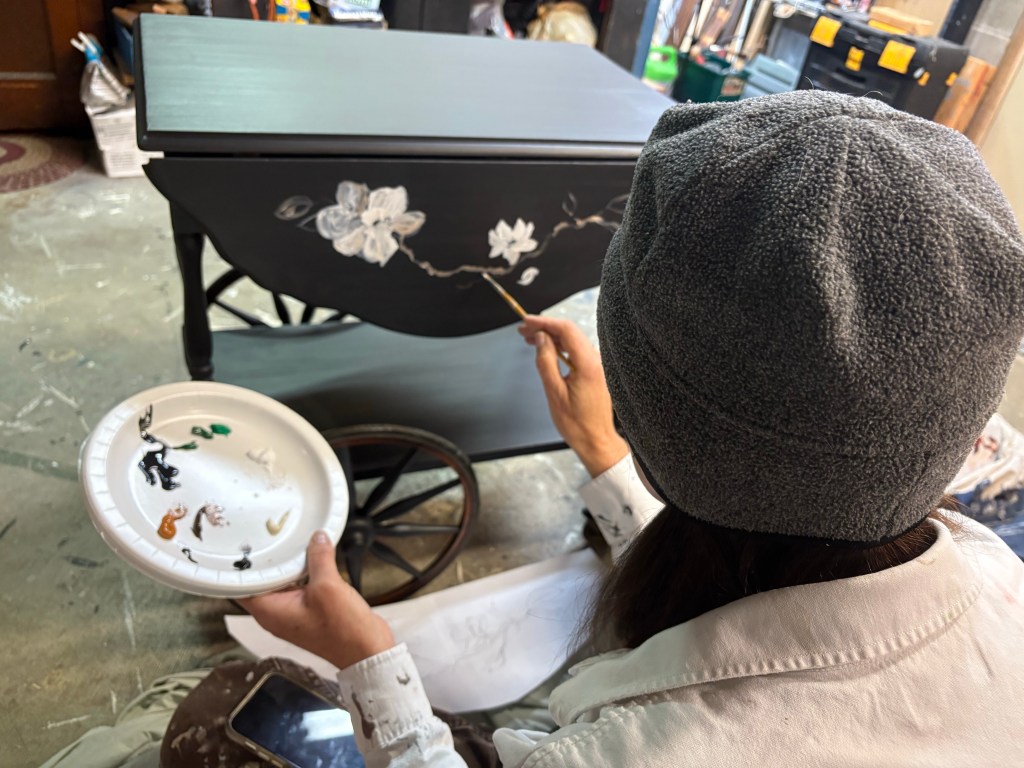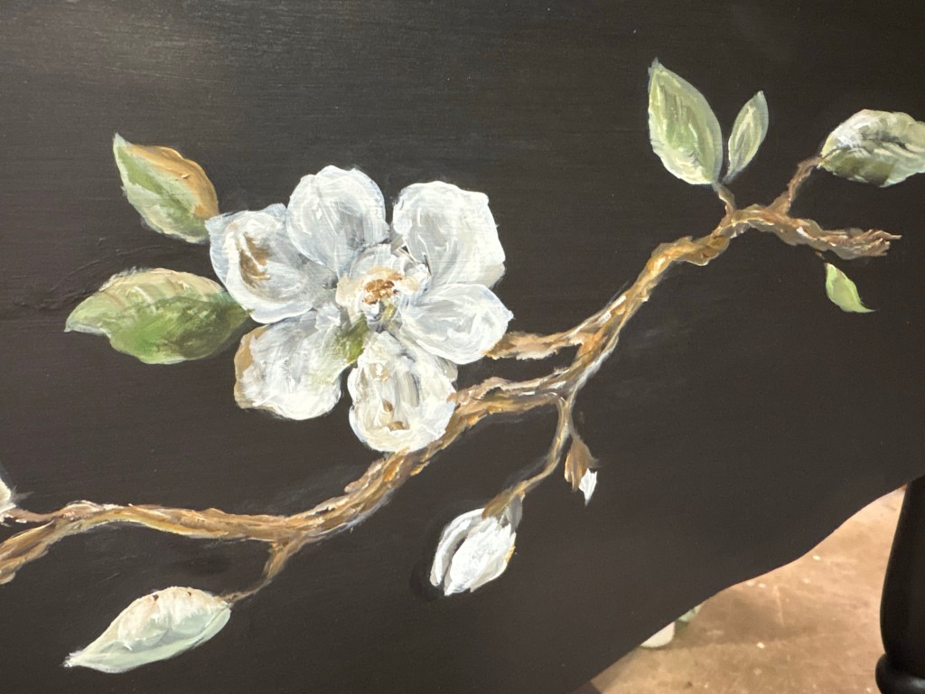 This was handed down from her mom & grandmother. I asked my talented friend Michele to paint some flowers on the side panels after I prepped, painted the base color and she did an amazing job as always.