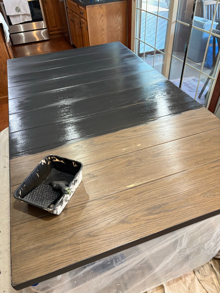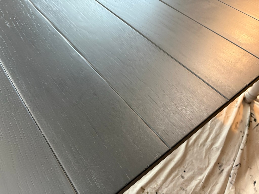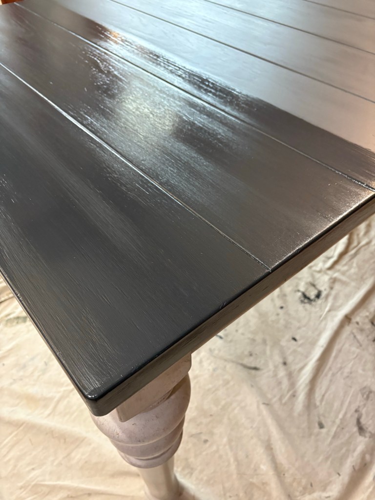 It was great to meet and help my client Diane to update her older kitchen table top. The legs and base look great after years of use but the top finish started chipping and fading.