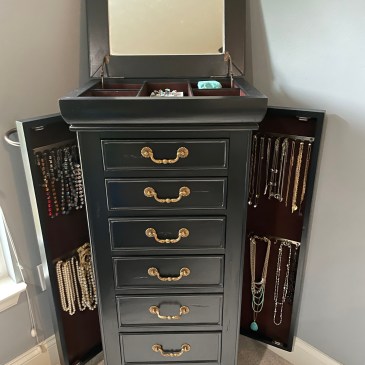 New master bedroom design/renovation project inspired my client to update and asked me to custom paint this special jewelry box to coordinate with new colors! Coal black with custom gold on existing hardware was a beautiful choice! Love the details on this piece and natural distressing in the wood for character. The satin finish sparkles … More Before & After Jewelry Storage
