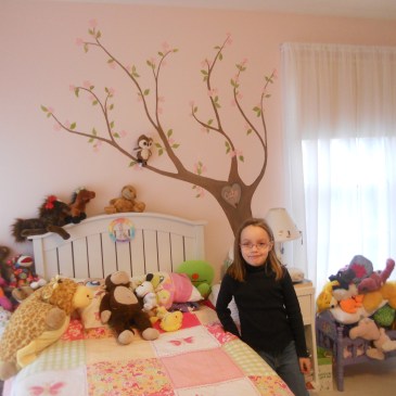 Loved this custom tree in Cate’s room and coordinating with the bedding theme and colors from Pottery Barn Kids. The tree and cherry blossoms were fun for her room! Thank you Cate for great ideas and such a fun project.