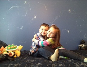 This is a magical Galaxy wall filled with bright glowing moon, stars, and sparkling constellations. Tyler loves Star Wars so this accent wall has some surprises (stars spell names of his family members but are hidden for he and friends to find.) I created my own character near his toy box and Tyler helped me … More Galaxy project for Tyler