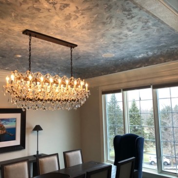 This faux finish involved painting 7-8 layers of colors after creating base of texture on this large dining room tray ceiling. I am so thankful to my dear friend and artist mentor, who coached me through creating various faux techniques to show my clients a variety of sample boards. Plus it helped me practice what … More Custom tray ceiling shines above this beautiful dining room!