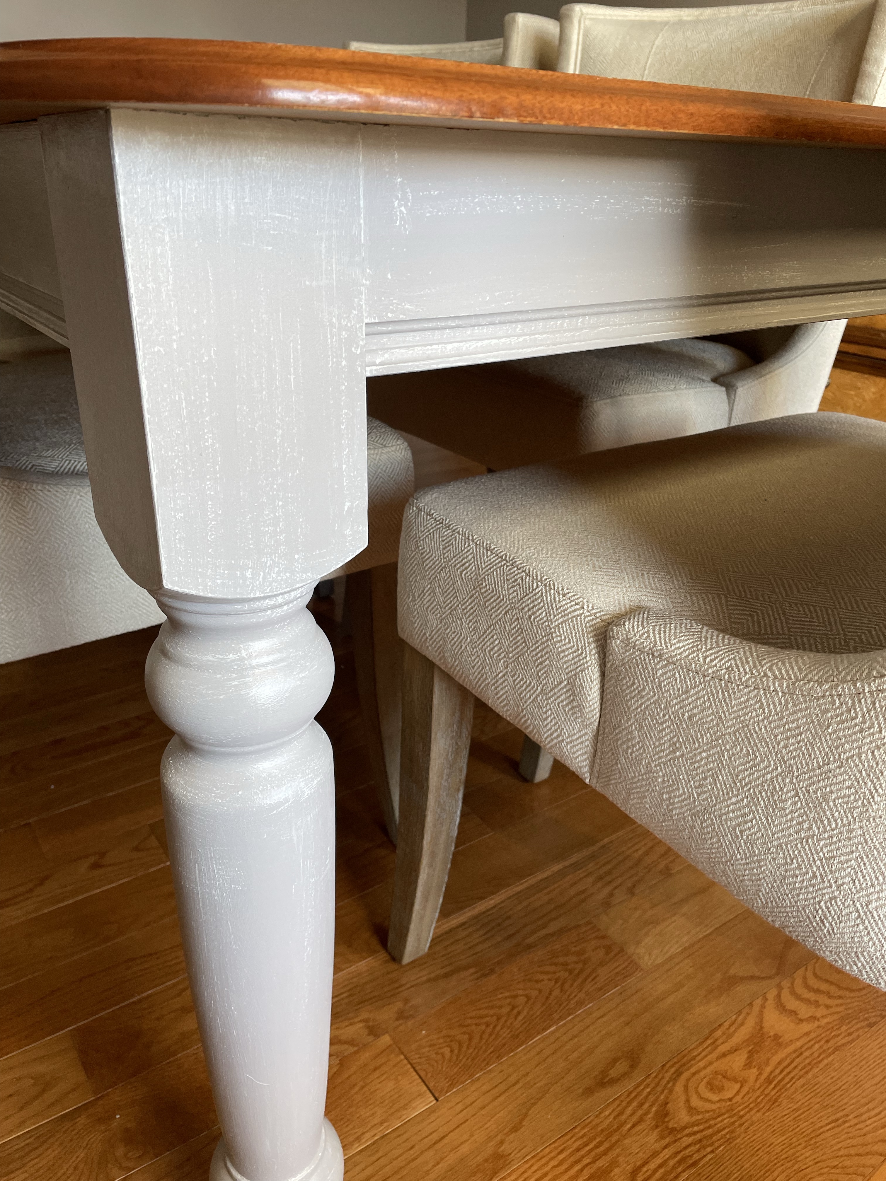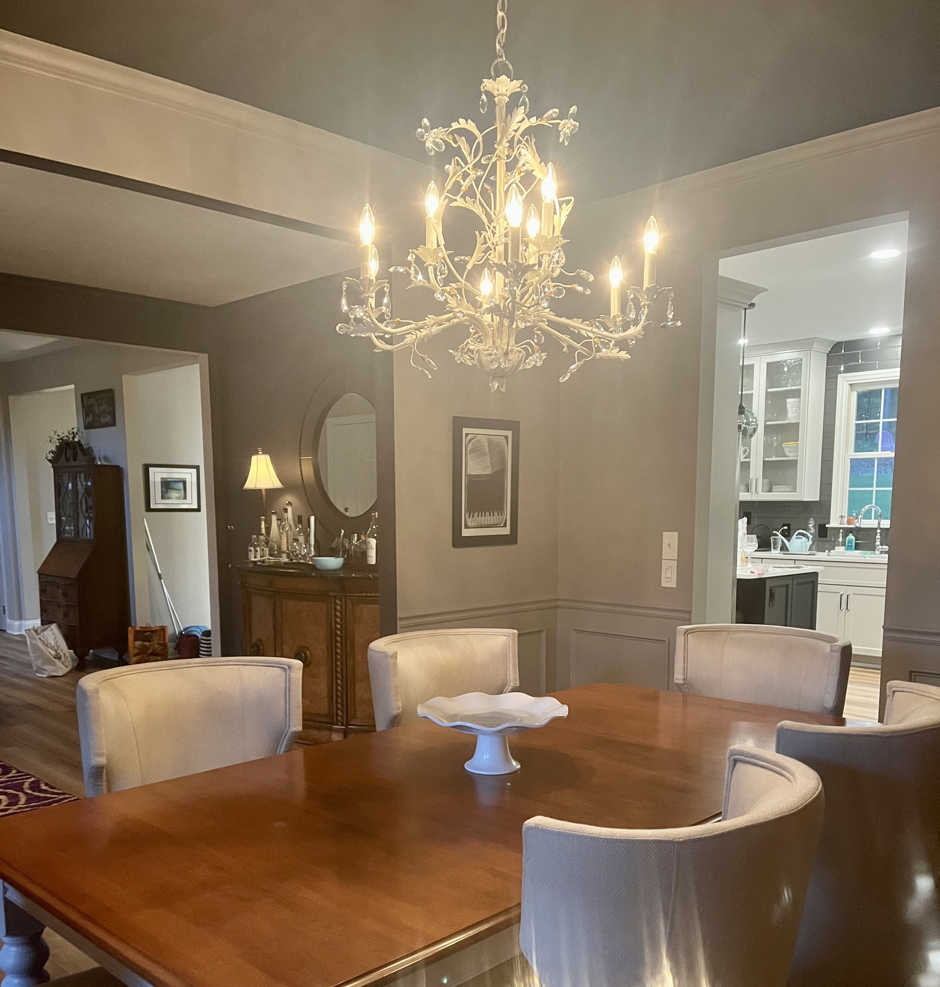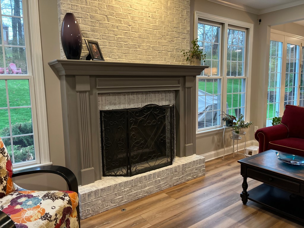 “I love how Lynn contributed to our first floor renovation. She painted a red brick fireplace I have not liked for years and made it a beautiful whitewashed finish. The painted mantel is the icing on the cake and compliments our new kitchen and paint colors throughout the house. In addition, she painted our kitchen table a lovely grey shade to match our new dining room. And I love the chandelier she revived from dark brass to a shimmering pearlescent creamy finish to compliment the dining room. She was painstakingly detailed with the chandelier, as it was tricky to paint. She has such an eye for color and attention to detail. She treated my projects as if they were her own and painted them perfectly!”